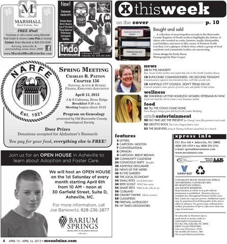 features 5 LetteRs 6 cARtoon: moLton 7 conveRsAtIons 8 oPInIon 9 cARtoon: BRent BRown 20 communIty cALendAR 24 conscIous PARty Benefits 30 AshevILLe dIscLAImeR 31 news of the weIRd 36 In the gARden 40 the LocAL economy 44 smALL BItes Local food news 48 BeeR scout WNC beer news 54 smARt Bets What to do, who to see 56 cLuBLAnd 63 cRAnky hAnke Movie reviews 68 cLAssIfIeds 70 fReewILL AstRoLogy 71 ny tImes cRosswoRd