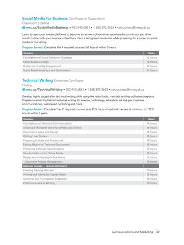 Online mru.ca/TechnicalWriting • 403.440.6861 • 1.888.392.3655 • cebusiness@mtroyal.ca Develop highly sought-after technical writing skills using the latest tools, methods and key software programs. Prepare to enter the field of technical writing for science, technology, education, oil and gas, business communications, web-based publishing and more. Program format: Complete the 10 required courses plus 22.5 hours of optional courses (a minimum of 172.5 hours) within 3 years. Courses