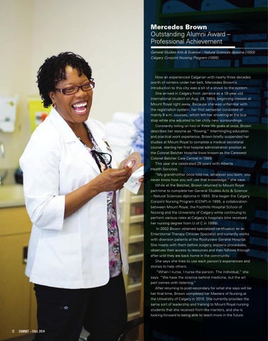 Now an experienced Calgarian with nearly three decades worth of winters under her belt, Mercedes Brown’s introduction to this city was a bit of a shock to the system. She arrived in Calgary from Jamaica as a 19-year-old international student on Aug. 28, 1984, beginning classes at Mount Royal right away. Because she was unfamiliar with the registration system, her first semester consisted of mainly 8 a.m. courses, which left her shivering at the bus stop while she adjusted to her chilly new surroundings. Constantly toiling on two or three life goals at once, Brown describes her resume as “flowing.” Intermingling education and practical work experience, Brown briefly suspended her studies at Mount Royal to complete a medical secretarial course, starting her first hospital administration position at the Colonel Belcher Hospital (now known as the Carewest Colonel Belcher Care Centre) in 1989. This year she celebrated 25 years with Alberta Health Services. “My grandmother once told me, whatever you learn, you never know how you will use that knowledge,” she says. While at the Belcher, Brown returned to Mount Royal part-time to complete her General Studies Arts & Science – Natural Sciences diploma in 1993. She began the Calgary Conjoint Nursing Program (CCNP) in 1995, a collaboration between Mount Royal, the Foothills Hospital School of Nursing and the University of Calgary while continuing to perform various roles at Calgary’s hospitals (she received her nursing degree from U of C in 1999). In 2002 Brown obtained specialized certification as an Enterstomal Therapy Clinician Specialist and currently works with diversion patients at the Rockyview General Hospital. She meets with them before surgery, explains procedures, observes their access to resources and then follows through after until they are back home in the community. She says she tries to use each person’s experiences and stories to help others. “When I nurse, I nurse the person. The individual,” she says. “We have the science behind medicine, but the art part comes with listening.” After returning to post-secondary for what she says will be her final time, Brown completed her Masters of Nursing at the University of Calgary in 2010. She currently provides the same sort of leadership and training to Mount Royal nursing students that she received from like mentors, and she is looking forward to being able to teach more in the future.