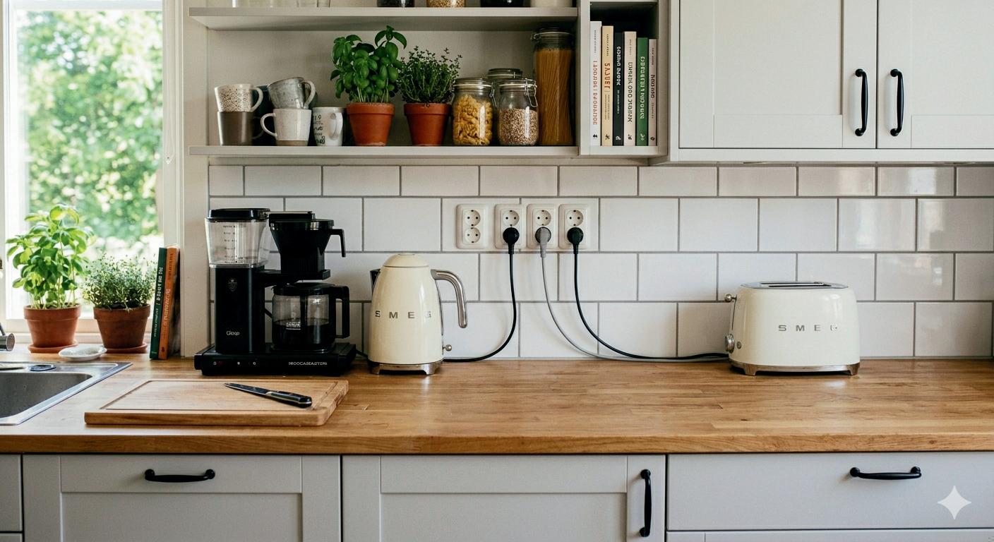 Een keuken of werkkamer met overtollige elektronische apparaten en kabels geeft een rommelige indruk. Verwijder de overtollige apparaten en bind de resterende losse kabels samen voor een verzorgde indruk.