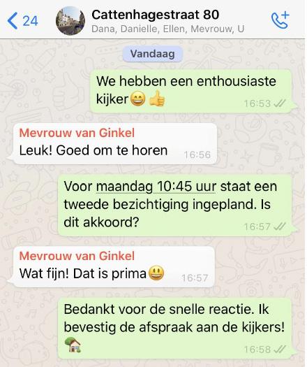 Snelle communicatie en korte lijnen met u vinden wij belangrijk. U krijgt hiervoor uw eigen WhatsApp groep. In deze groep zitten, naast de verkopers, onze office manager en ook onze makelaars. Zo kunnen we snel en praktisch met elkaar communiceren en is iedereen altijd goed geïnformeerd.