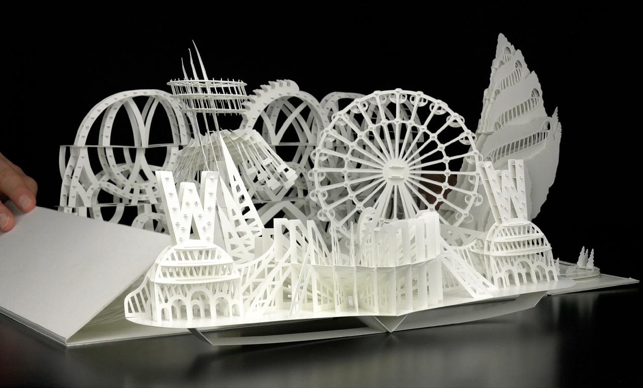 I had only the very vague drawings from the storyboard. The pop-up was to be made of white cardboard so I could not use any colored elements and/ or illustrations. The exact design of the park, also the selection and arrangement of the carousels, was completely up to me. When coordinating the technical features with the production designer Paul Harrod.1