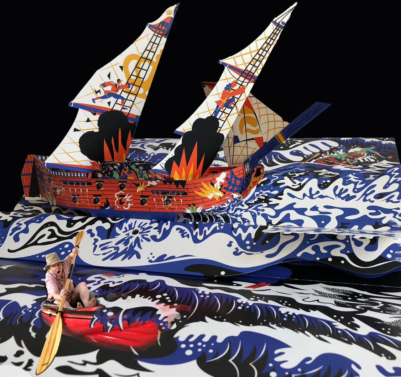 In last issue's Part One of Maaike's excellent survey of the history and precepts of The French School of Movable Books, among the photos of actual works, paper engineers, and illustrators, there were some cheekily humorous photos of Patrick Lecoq kayaking through the layout. Some missed the small caption on the title page that explained the intent of the photos and wondered... what?