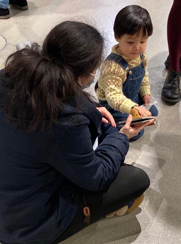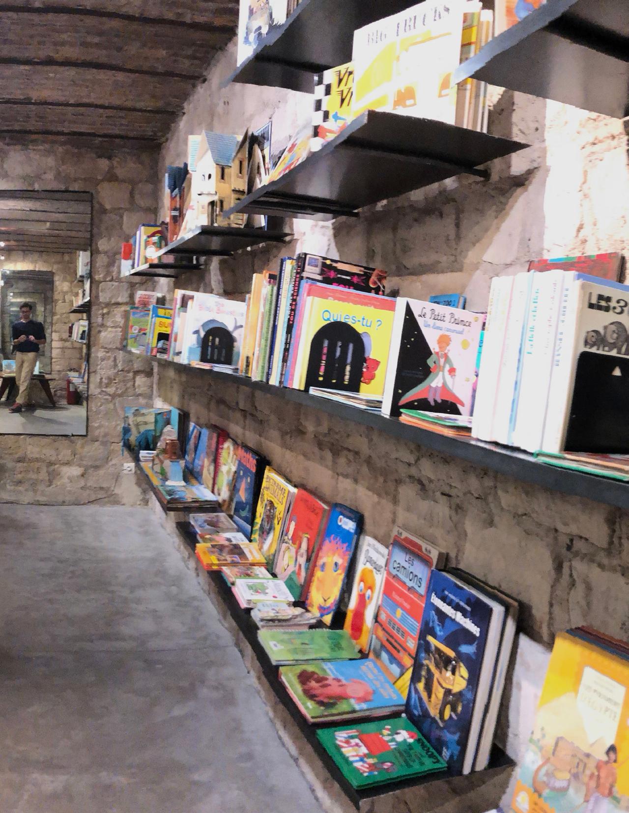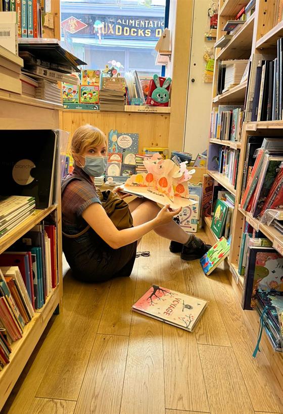 Gérard lo Monaco showing the dummy of Voyage en train, 2018 at the Salon. Published in 2020 by Albin Michel Jeunesse, 9782226449290, as A Train Journey by Thames&Hudson. Kelli Anderson, New York-based paper engineer and tinkerer, visiting a French bookstore this summer. Kid in a bookstore. Photo ©Maaike Van der Meulen
