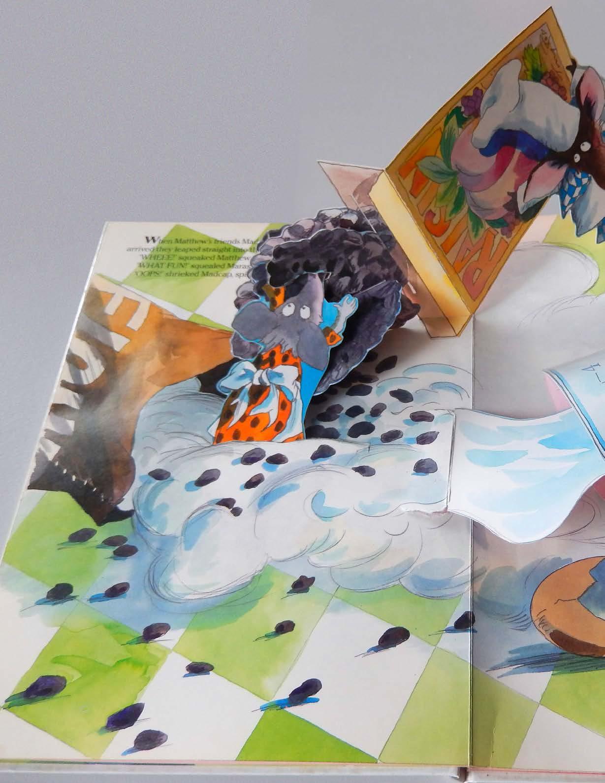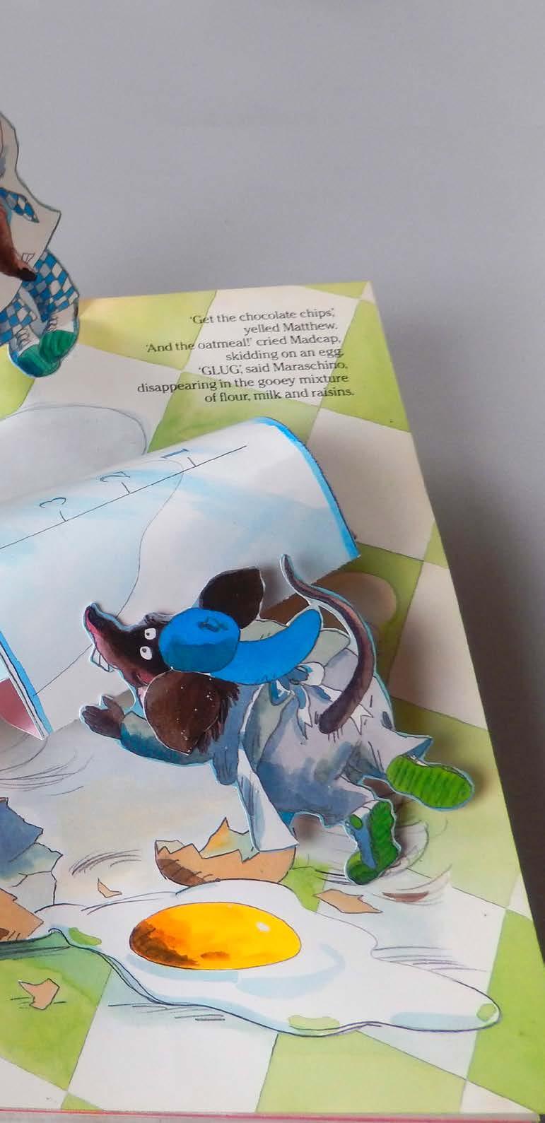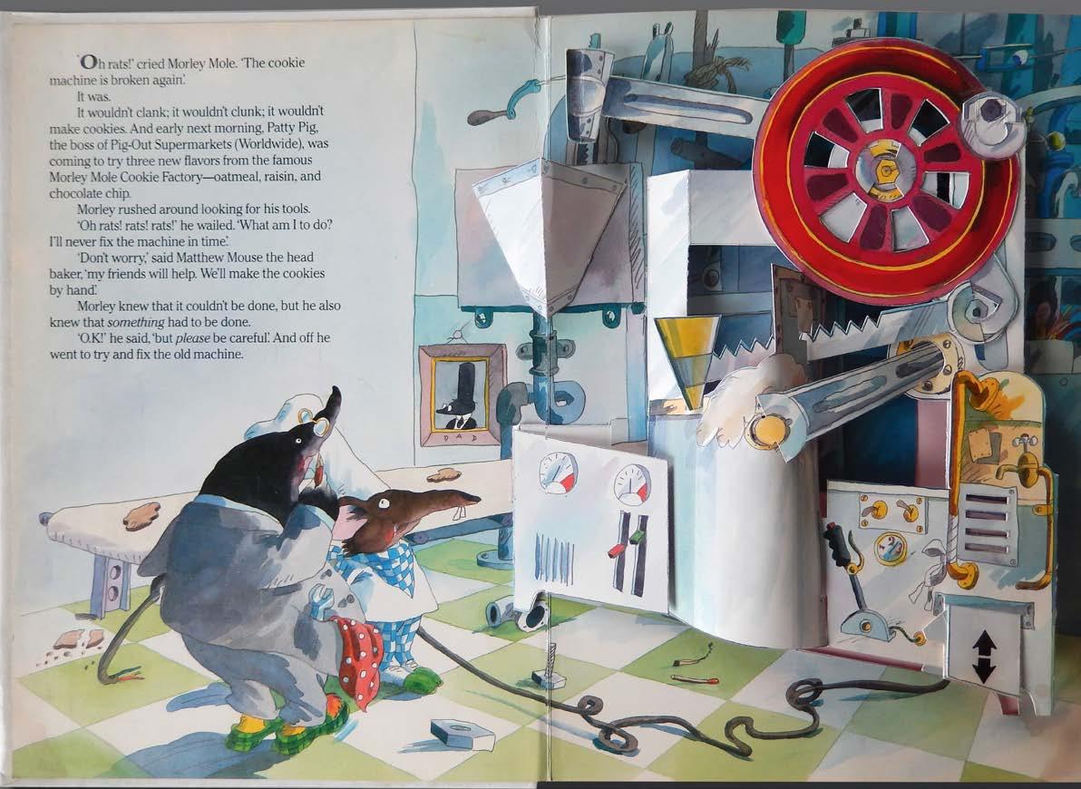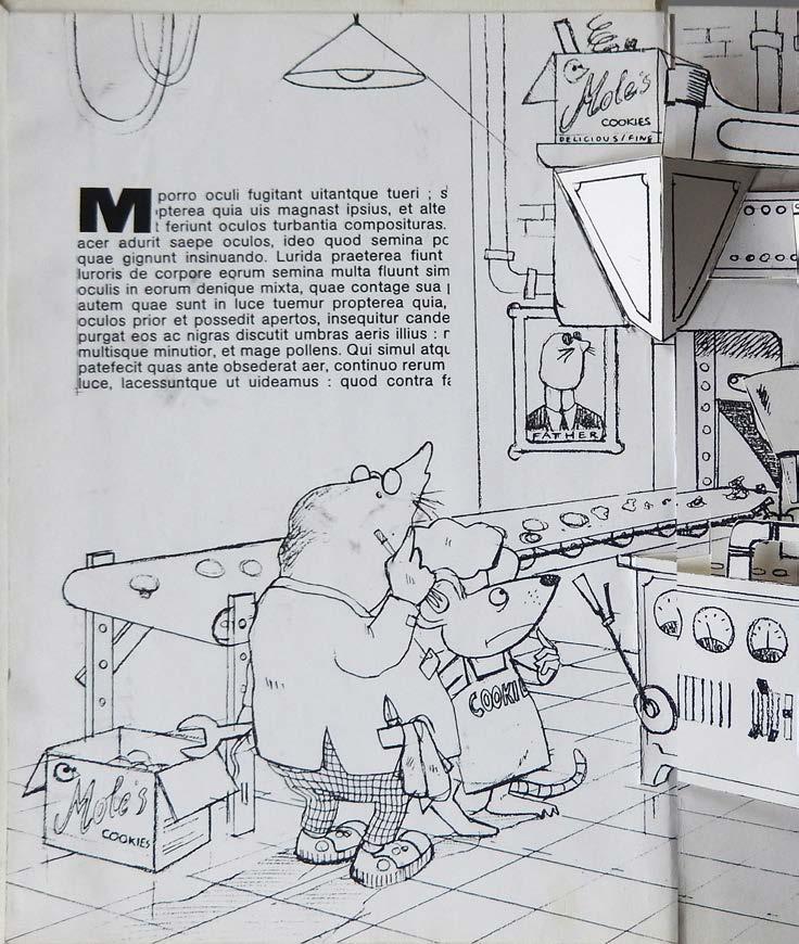 In the new book, the text was written by Peter Seymour. The mice (there were four of them: Matthew, Madcap, Maraschino, and Mozart) now worked in Morley Mole’s Cookie Factory. While producing a large order for Patty Pig’s PigOut Market the cookie-making machine broke down and the four mice had to make the cookies by hand now. Morley Mole tried to fix the machine while the mice made a big mess producing the cookies. At the very end, of course, the messy handmade cookies had weird shapes but tasted delicious. All’s well that ends well. Everybody happy. To increase the market for this book ICI asked the very popular British illustrator Tony Ross to illustrate the story. Of course, I still did the paper engineering. Initially, the title was Morley Mole and the Cookie Surprise but was later changed to The Craaazzyy Cookie Factory. A pop-up book by Tony Ross.