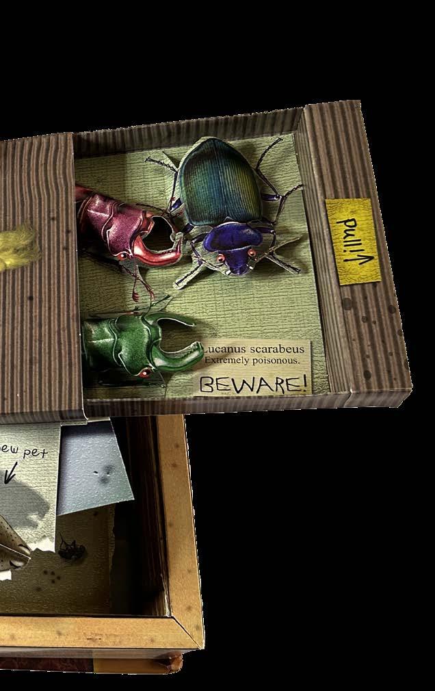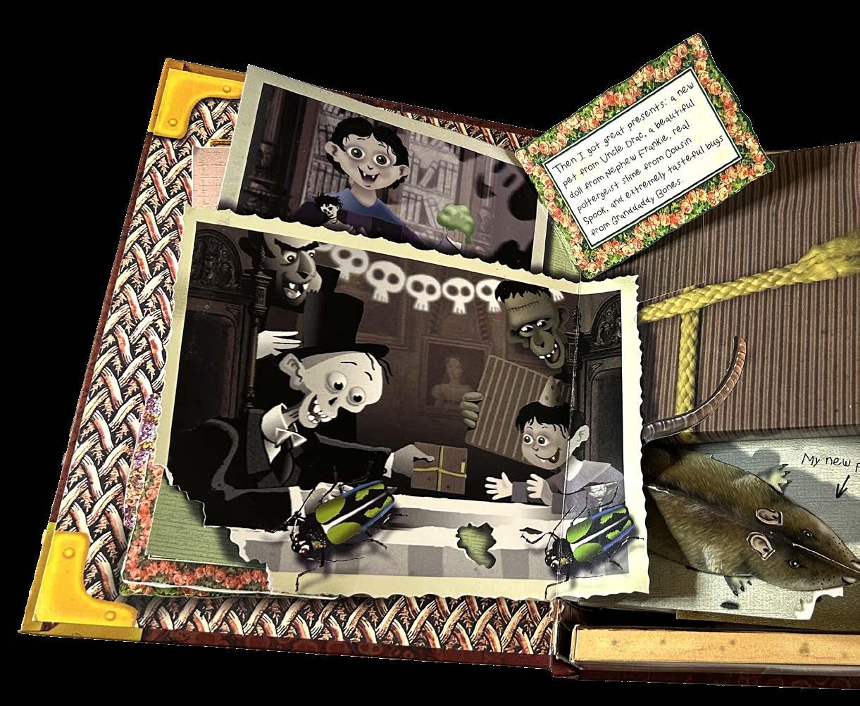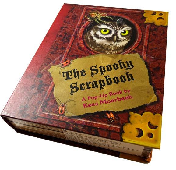 construction, where the reader has no idea what to expect, because it is not a recognizable book shape. I’m very happy with RolyPoly. Again, this is based on a quote. This time Arthur Schopenhauer: “We live in the expectations for the better. At the same time with regret to the past. The present is the way to the goal. That’s why most people, at the end of their life, discover that they’ve lived all the time ‘ad interim’ and that they will see that what they’ve carelessly and without joy let pass was their life. That was the exact thing they have been waiting for their entire life. As a rule this counts for mankind. Fooled by hope they dance Death into the arms.” Not a very optimistic view of life, especially for a children’s book, but as a basis, very useful. The unfolding of this box, encouraged by a mixture of hope and curiosity, creates at the very end a long "snake" of paper. That’s the main attraction of this book. Pop-up brought back to the essence. The unfolding itself is the way to the goal. The pop-ups and the story come second. Another book that works well for me is The Spooky Scrapbook. Because it’s a box in the shape of a book it made it possible to contain