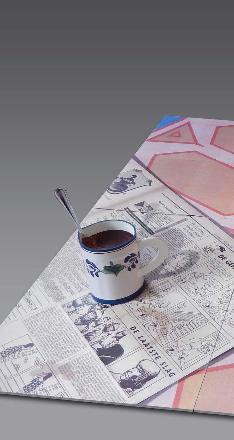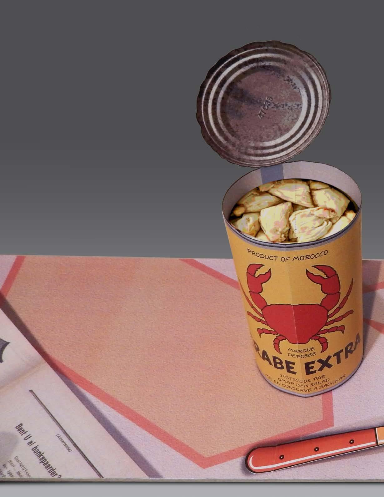 six spreads had to be connected to each other in a way that could be unfolded into one big unit. As the size of the pages was A4 (8,3 by 11,7 inches) my paper tabletop would end up as one big piece of 33 by 35 inches, showing six or seven objects plus some knives and spoons. To introduce a certain absurdism I added an opened can of crab meat and a big red fish. The can of crab meat, for those of you unfamiliar, is an homage to Hergé’s Tintin (The Crab with the Golden Claws). As a great admirer of Tintin, I simply had to put that Crab Extra on this table.