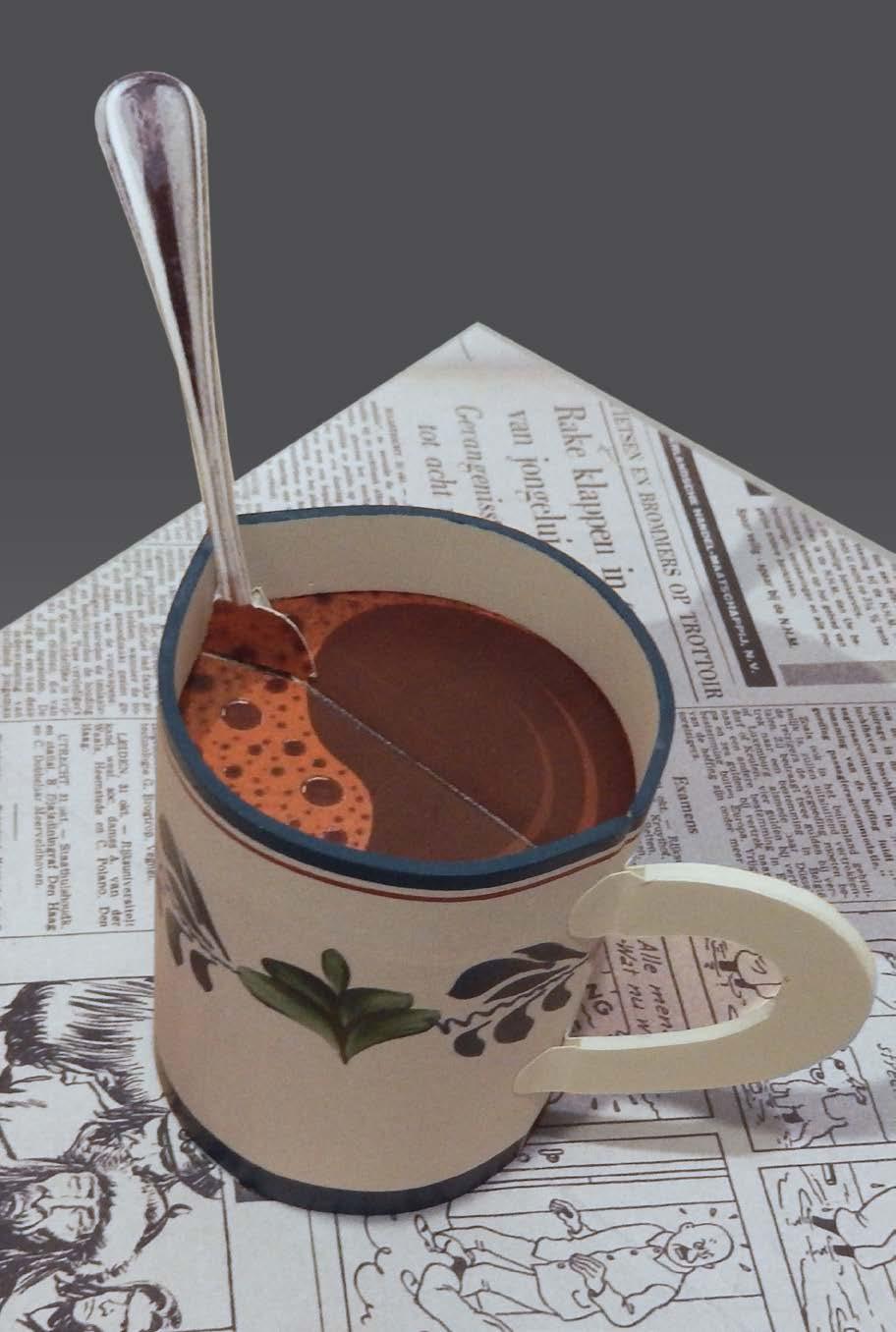 A breakfast table scene seemed the best starting point for me then: a cup of coffee, a newspaper, a piece of cheese with a cheese slicer, a tin of biscuits, and anything else that’s part of the daily morning routine. All foldable and all in paper. But as it should represent a real tabletop a regular six-spread book wasn’t an option. The