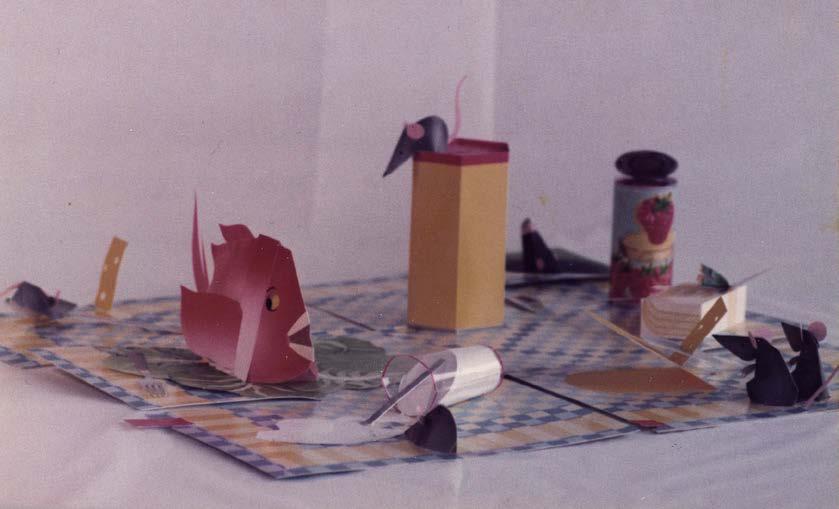 Also, he thought the unfolding of the six spreads into a flat tabletop was slightly too complicated. Wally asked me if I could build a new prototype, with better internationallyrecognizable objects and a simpler way of unfolding. And he suggested I add some mice too, to make it more vivid. Possibly a deserted picnic scene where the mice had fun exploring all the festivities and goodies. In other words: he invited me to translate this table into a more universal and possibly more commercial product.