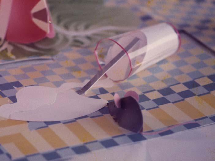 In the next months, I reworked the concept, together with my wife, Carla Dijs, and added the mice. I replaced the can of crabmeat, margarine, and cheese. I simplified the unfolding— but I left the big red fish in... just because I liked the construction and the absurdism, I recall. This time I used much better white cardboard and banned the cellotape. I renamed the project and called it simply The Picnic.