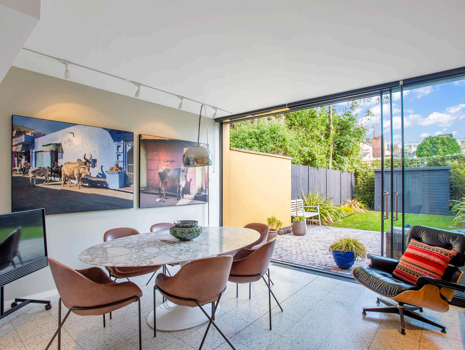 ‘We opened it up to create one large space, which connected the garden with what happens inside through the choice of flooring.’ The refurbishment took place across 15 months during the lockdowns and, over this period, the roof was taken off, ceilings were raised and the split landing on the ground floor was levelled out.