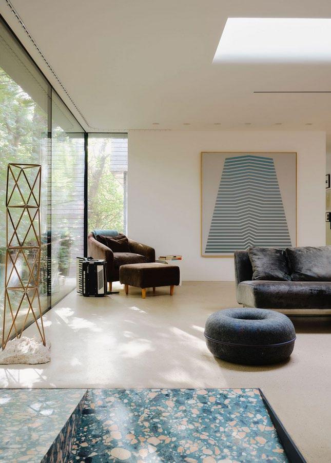 Floor-to-ceiling windows overlook Abney Park Cemetery, filling the space with shifting light, a theme central to Rana’s art. “I needed this space to bring calmness,” she says. The result is a seamless blend of home, studio, and artistic vision, where creativity and nature coexist beautifully.