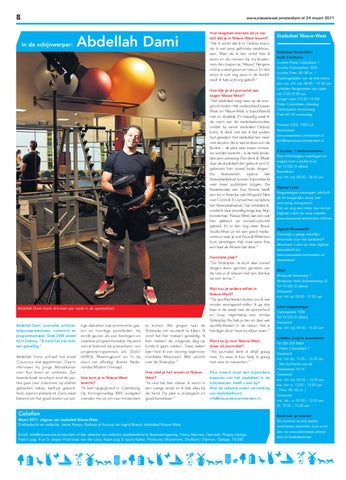 Colofon Maart 2011, uitgave van stadsdeel Nieuw-West. Eindredactie en redactie: Janna Koops, Radoua el Azzouzi en Ingrid Breed, stadsdeel Nieuw-West. Email: info@nieuwwest.amsterdam.nl (ter attentie van redactie stadsdeelkrant). Basisvormgeving: Fanny Morrien, Opmaak: Floppy Design, Foto's pag. 4 en 5: Jesper Post/José van der Loos. Kaart pag 5: Laura Kalter. Productie: Movement, Drukkerij: Dijkman. Oplage: 70.000.