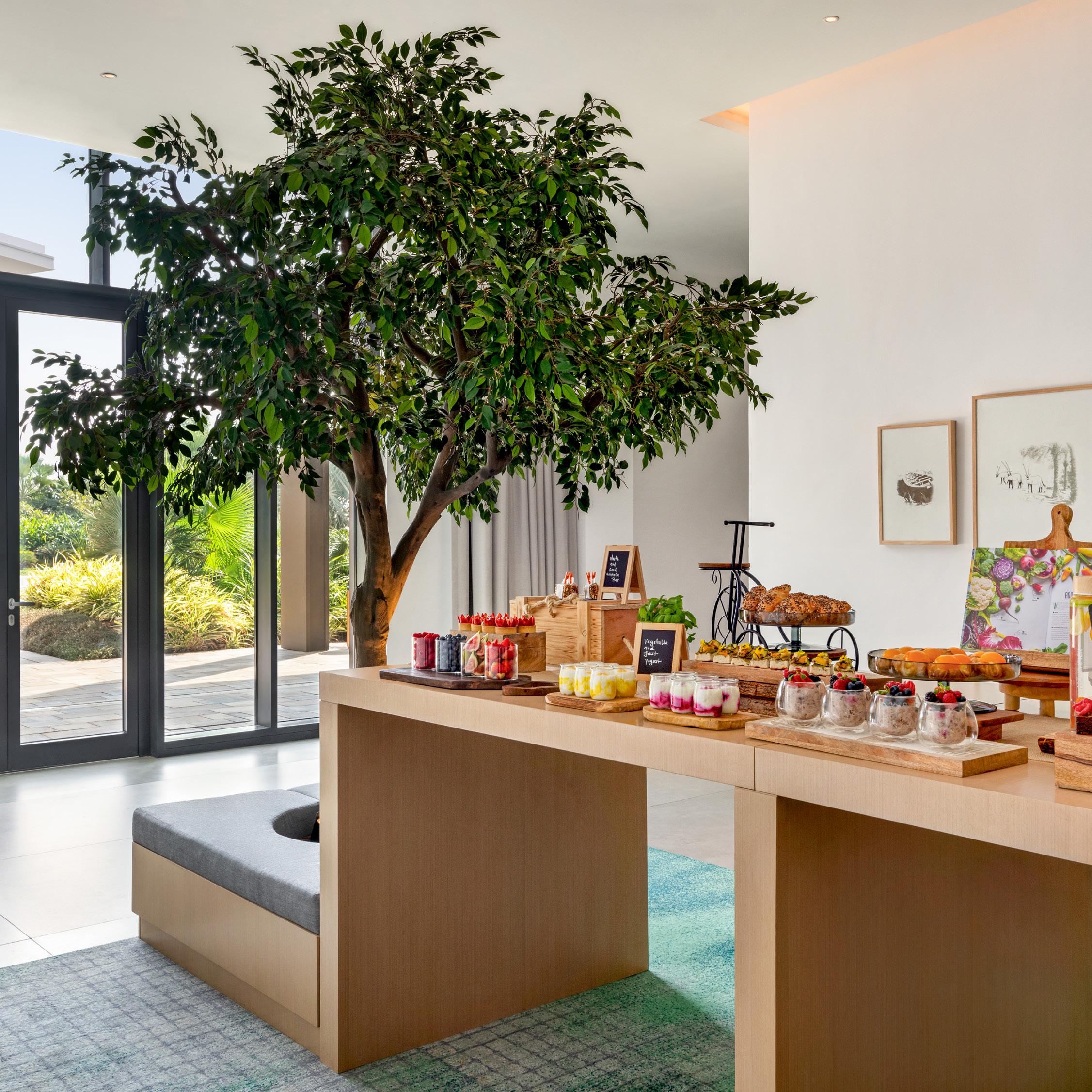 Experience the expansive Jais pre-function area, where coffee breaks are elevated to a delightful affair. Indulge in a variety of light bites, Mövenpick’s signature coffee, and fresh juices, all within a spacious setting. Our talented pastry team crafts healthy bites, delectable food items, and exquisite desserts to tantalize your taste buds. Enjoy the open outdoor spaces for a breath of fresh air, perfect for unwinding between sessions. With ample room and exceptional offerings, the Jais pre-function area promises an invigorating and memorable experience for all your events.