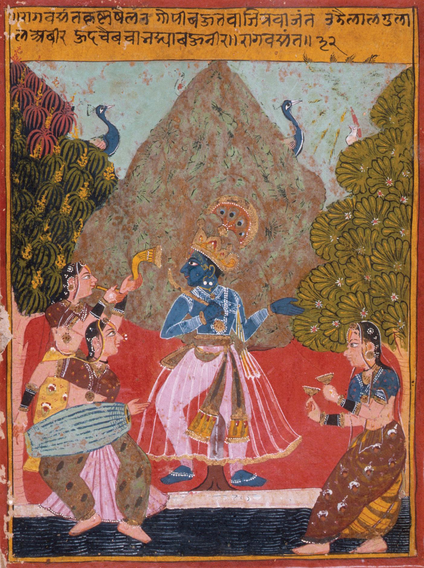 Krishna Dances to the Accompaniment of Female Musicians, Personifying the Musical Mode Vasanta Ragini (detail), circa 1675–1700, India; Rajasthan, Marwar, opaque watercolors and gold on paper, Los Angeles County Museum of Art, Gift of Paul F. Walter, M.81.280.3