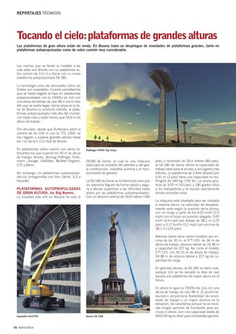 Tocando el cielo: plataformas de grandes alturas Las plataformas de gran altura están de moda. En Bauma hubo un despliegue de novedades de plataformas grandes, tanto en plataformas autopropulsadas como de sobre camión muy considerable.
