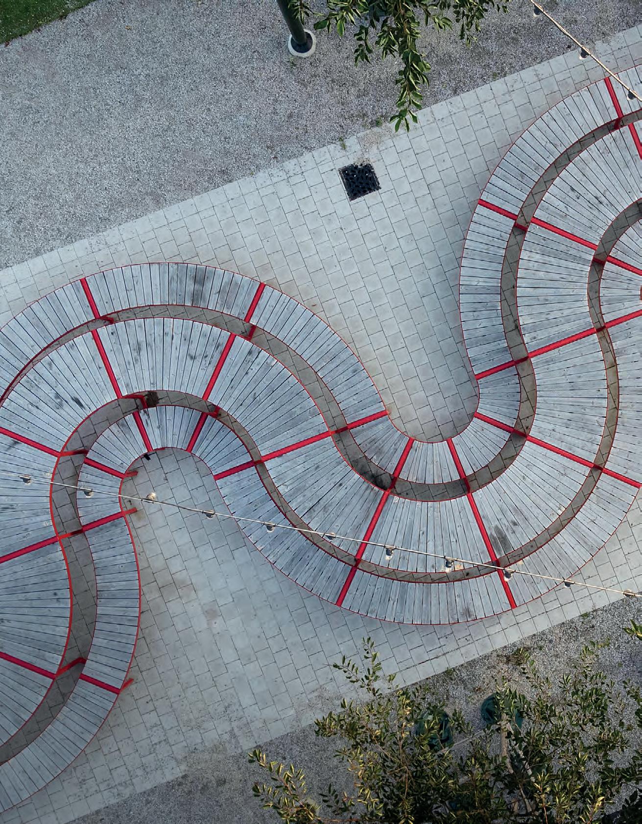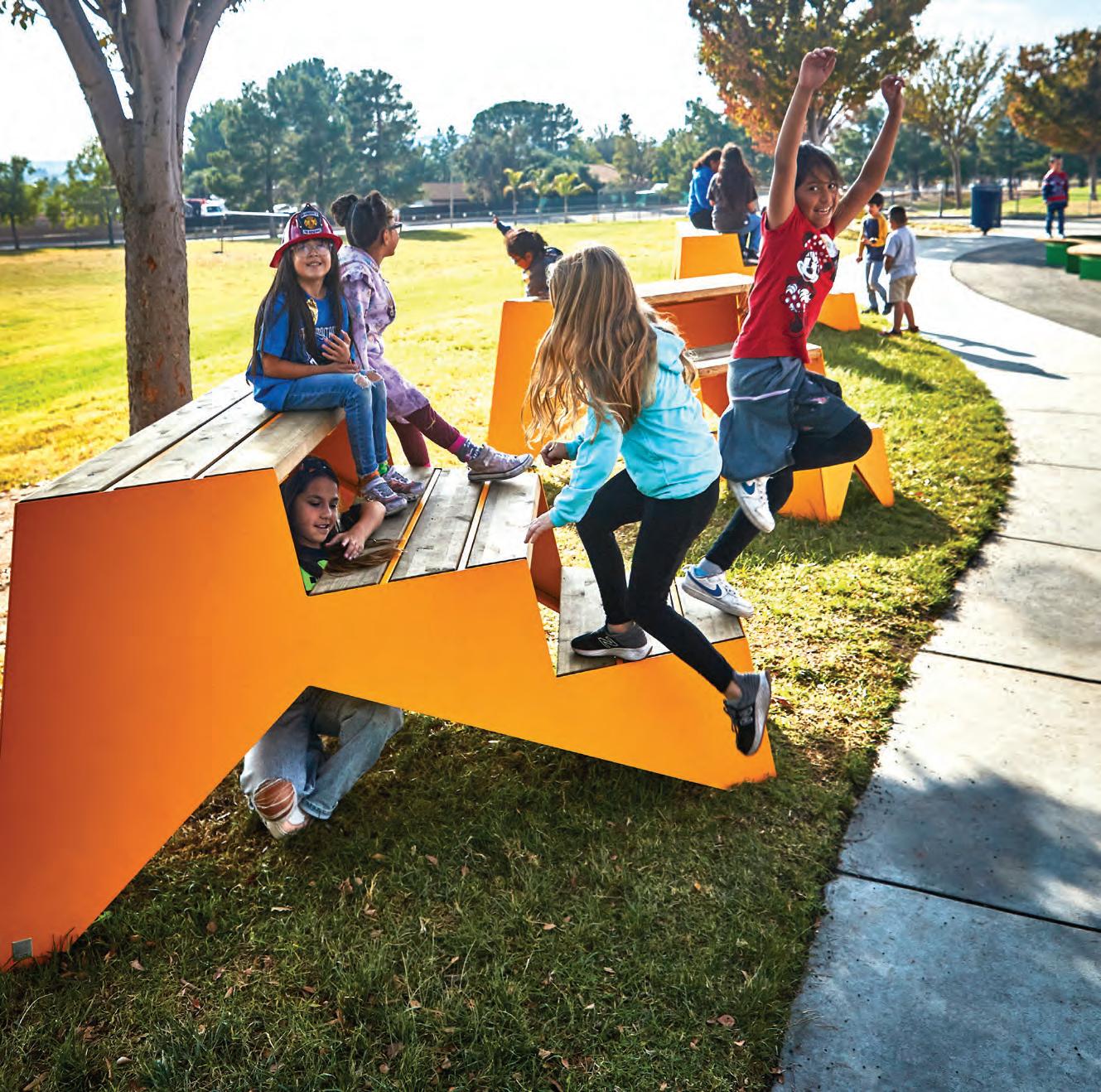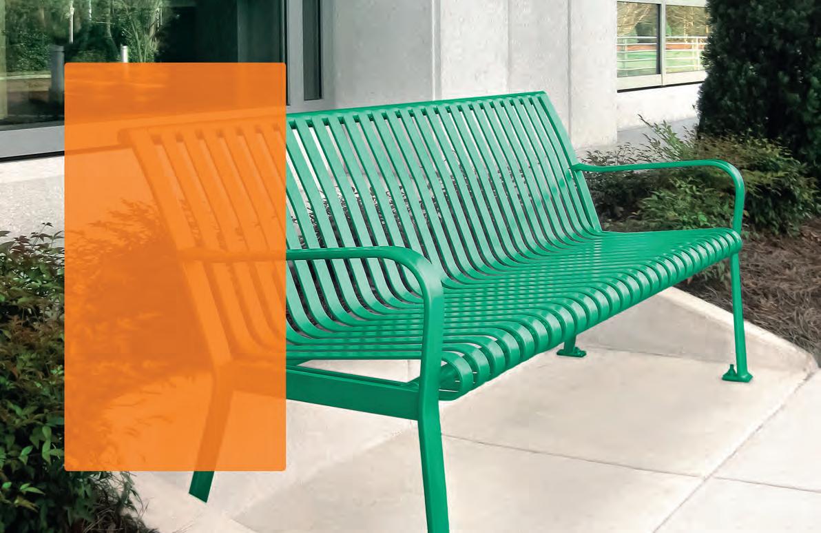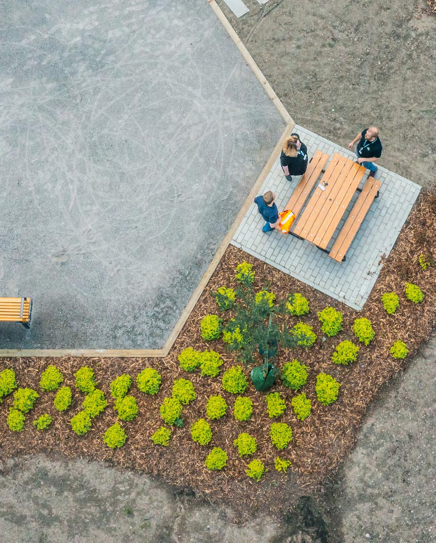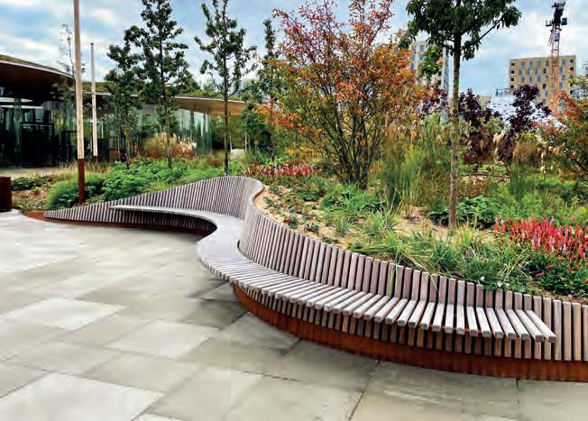 Som en naturlig förlängning av kantstödet till de upphöjda växtbäddarna bildar parksofforna mysiga rum längs de dynamiska gångsystemen.