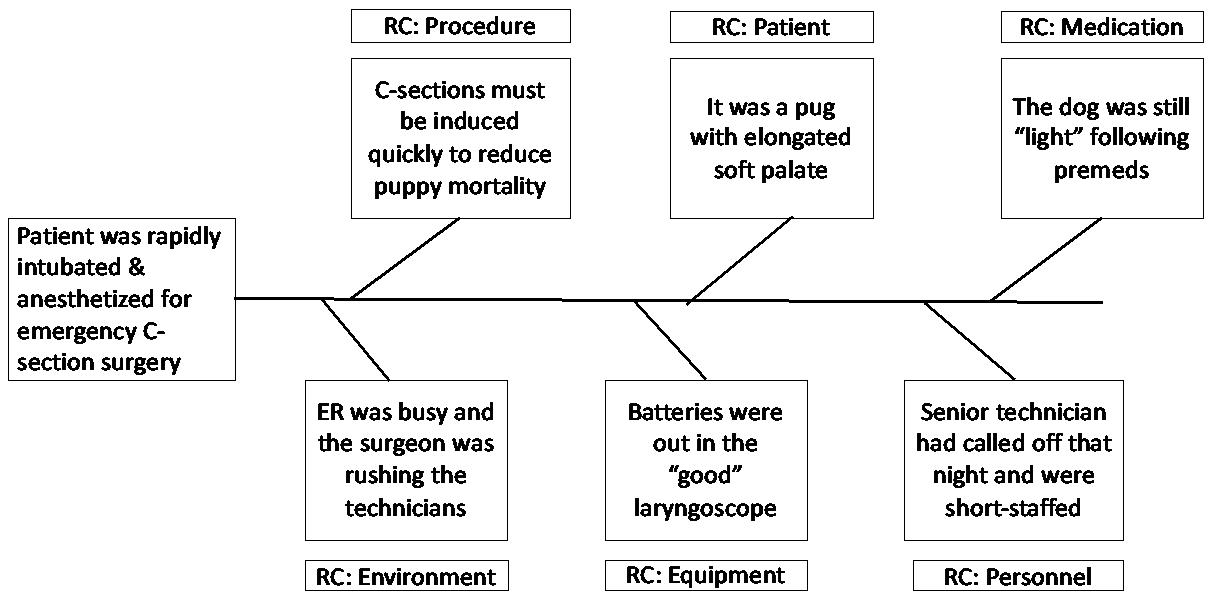 Following definition of a clear timeline, steps in the cause-and-event process are identified. Generally, with any given event, there can be several causes that can be generally grouped into the following categories: Equipment, Organization, Procedure, Medication, Patient, Environment, People (Individual or Personnel). A “fishbone diagram” is a visual format that can be used to organize the contributing factors. The figure provides an example of a fishbone diagram for one of the events identified for the case example below.