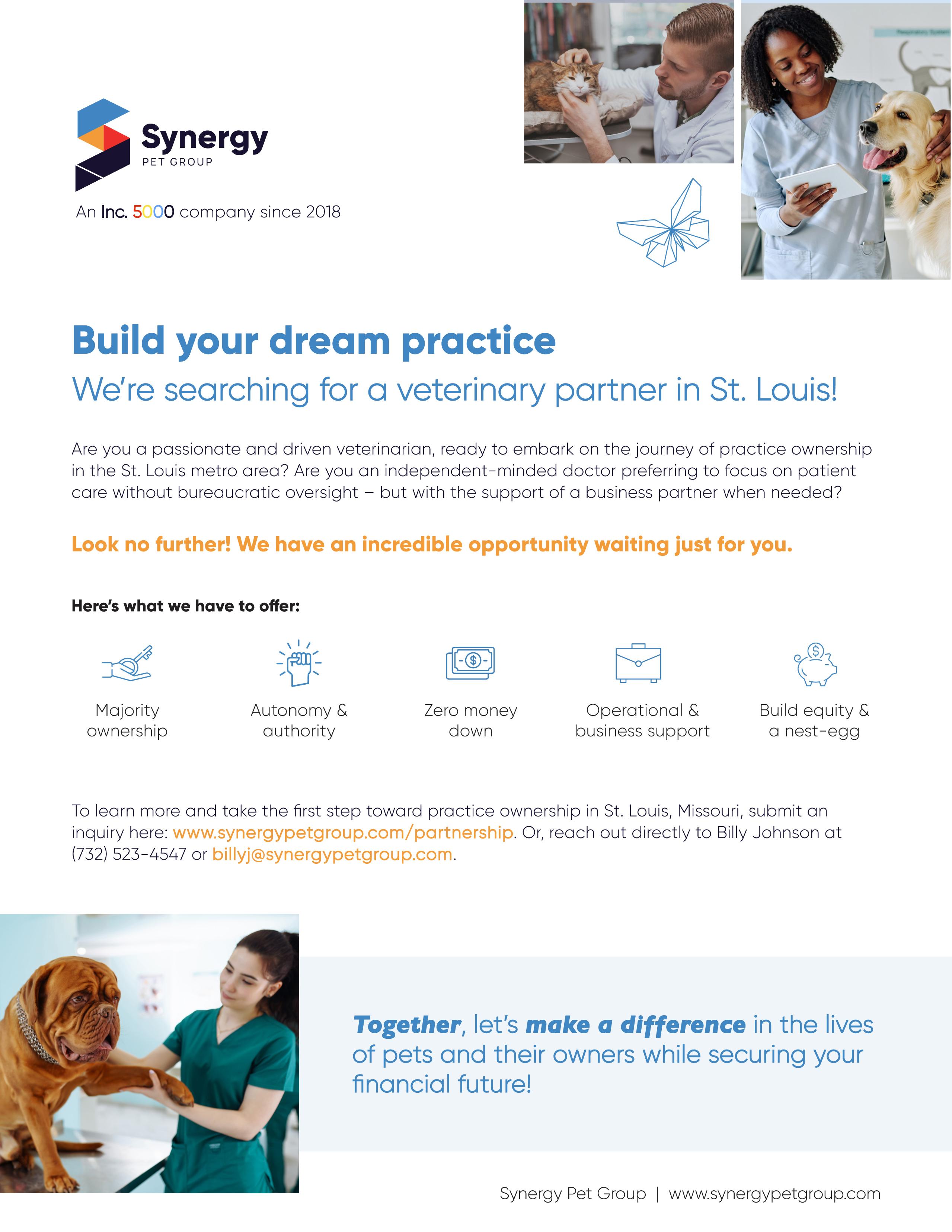 Join an established St. Louis practice as majority owner – no upfront financial investment needed. A successful, compassionate team at an established St. Louis veterinary practice is looking for a partner to guide the medical direction of the practice. You will have the freedom and flexibility to lead patient care, while our team is there to support you when called upon.