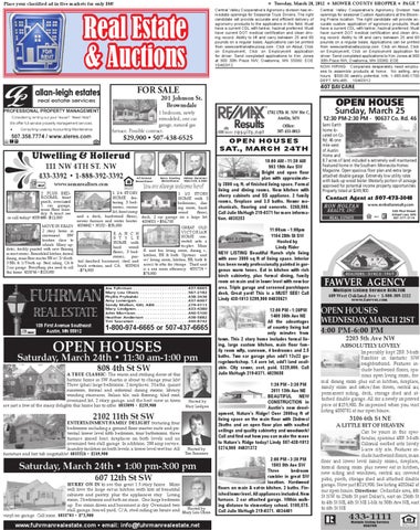 OPEN HOUSEs sat., March 24th 10:00 AM - 11:30 AM 903 19th Ave SW Bright and open floor plan with approximately 3800 sq. ft. of finished living space. Formal living and dining rooms. New kitchen with cherry cabinets and SS appliance. 2 family rooms, fireplace and 3.5 baths. Newer mechanicals, flooring and concrete. $268,500. Call Julie McHugh 219-0371 for more information. 4035253 11:00am - 1:00pm 1104 28th St SW Hosted by Lindy Rider NEW LISTING Beautiful Ranch style living with over 3800 sq ft of living space. Interior has been newly professionally painted in gorgeous warm tones. Eat in kitchen with rich birch cabinetry, plus formal dining, family room on main and in lower level with new bar area. Triple garage and screened porch/open deck. Great yard! This is a MUST SEE! Call Lindy 438-1013 $299,900 #4035621 12:00 PM - 1:30PM 1400 36th Ave NE All the advantages of country living but only minutes from town. This 2 story home includes formal living, large custom kitchen, main floor family room w/fp, sunroom, 4 bedrooms and 2.5 baths. Two car garage plus add’l 13x22 garage/workshop. 1.4 acre lot, add’l land available. City sewer, asst. paid. $229,000. Call Julie McHugh 219-0371. 4029658 1:30 PM - 3:30 PM 2011 13th Ave NE BEAUTIFUL NEW CONSTRUCTION in Austin’s new development, Nature’s Ridge! Over 2000sq ft of living space on the main floor with 2bdrms/ 2baths and an open floor plan with vaulted ceilings and quality cabinetry and woodwork! Call and find out how you can make the move to Nature’s Ridge today! Lindy 507-438-1013 $274,900 #4031372 2:00 PM - 3:30 PM 1803 5th Ave SW Three bedroom rambler in great SW location. Hardwood floors on main & eat-in kitchen. 2 baths. Finished lower level. All appliances included. New furnace. 2 car attached garage. Within walking distance to elementary school. $105,575. Call Julie McHugh 219-0371. 4034401