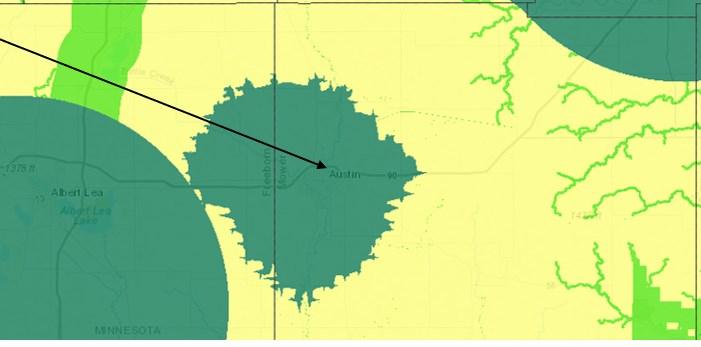 Priority areas (dark green is the highest) are shown on a map of Mower County.
