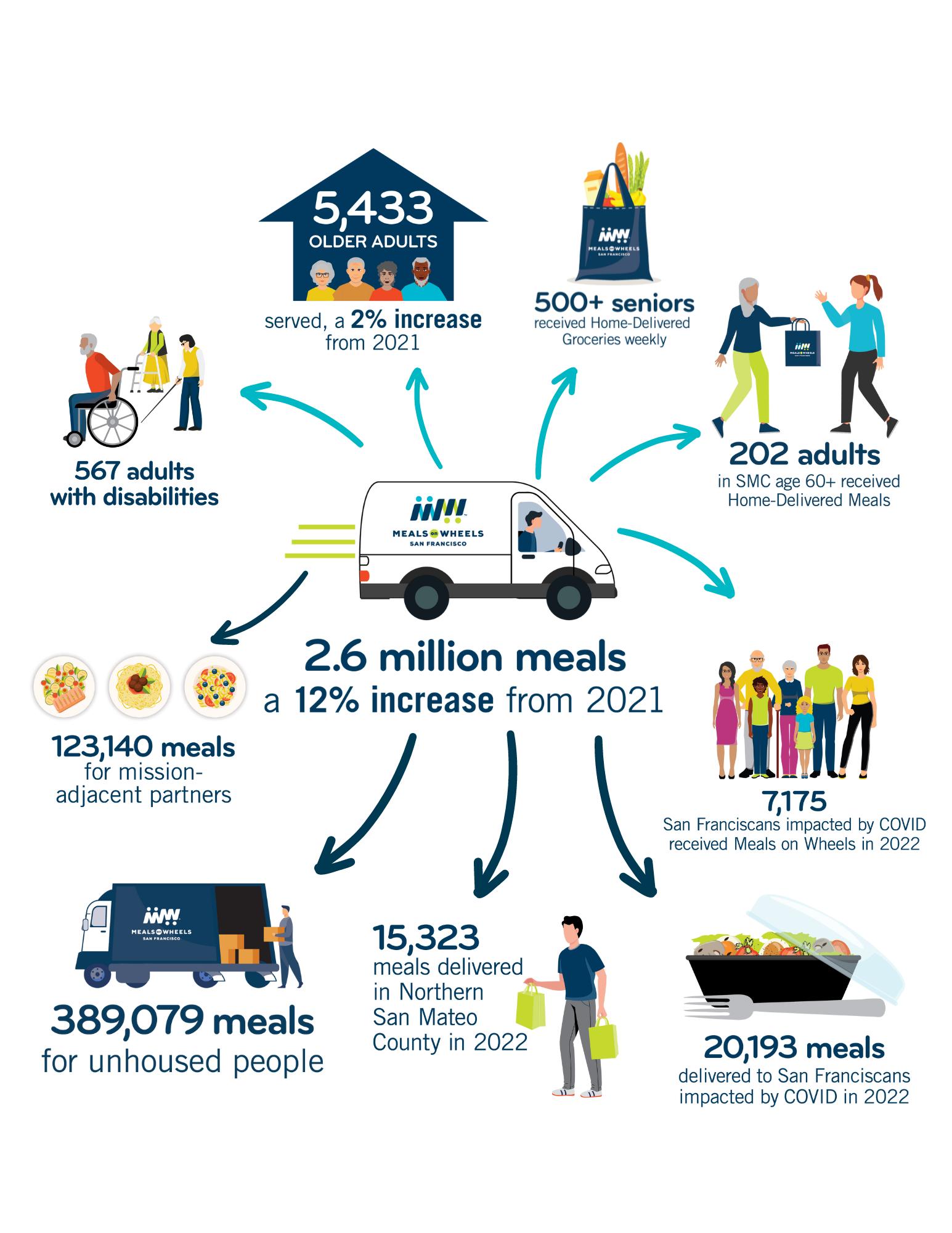 For the first time in our 50+ year history of providing meals to older San Franciscans, we expanded our geographic region to delivering meals to the homes of seniors living in Northern San Mateo County. While Meals on Wheels is new to the county, we have been providing meals and services to older homebound San Franciscans since 1970, so it made sense for us to become the provider of meals to more than 200 seniors there as well. In early 2023, that need has grown to over 300 people