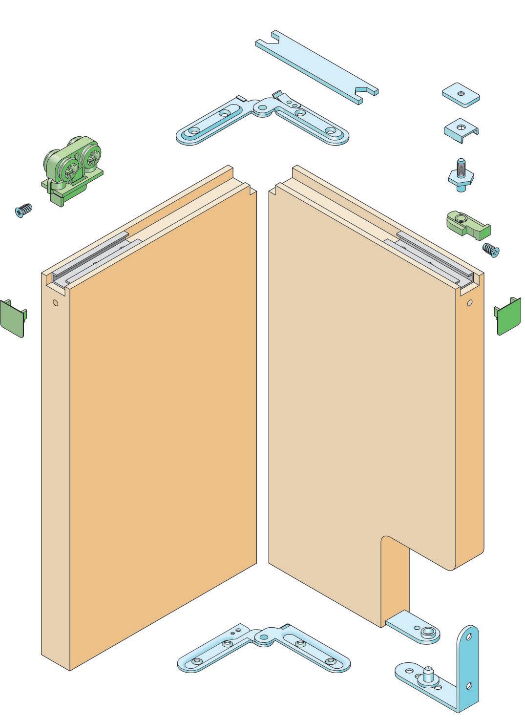 Podľa uchytenia a zafrézovania systému HIDDEN môžeme dvere otvoriť celou šírkou krídla alebo čiastočne. Pri zafrézovaní posuvnej lišty 10 mm od okraja bude posuvný systém neviditeľný. V prípade frézovania posuvnej lišty v celej dĺžke sa na kraje lišty zasunú krytky. Posuvný vozík sa uchytáva na stranu smeru otvárania dverí.