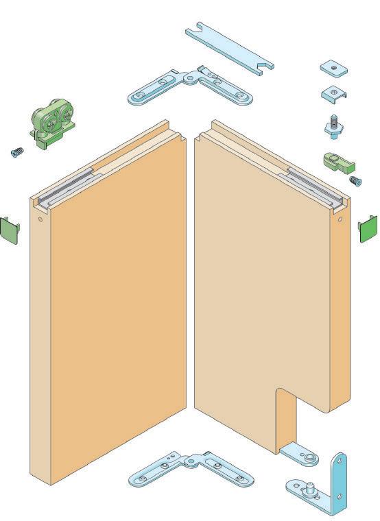 Pre tento typ dverí sú určené sety 100 FOLDING DOOR. Ponúkané 2 typy setov sú určené pre drevené dvere hrúbky do 30 mm alebo do 40 mm a maximálnej váhy do 60 kg. Dvere môžu byť pri použití tohto systému zalamované v strede alebo asymetricky. Pre montáž setov 100 FOLDING DOOR je potrebné iba jednoduché frézovanie.
