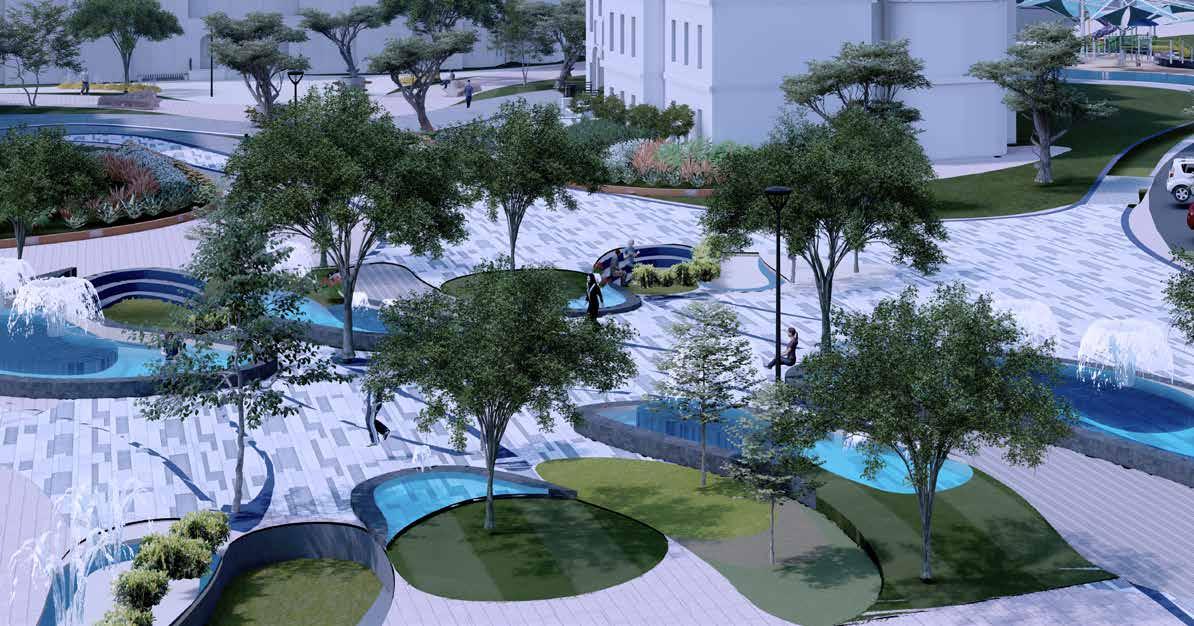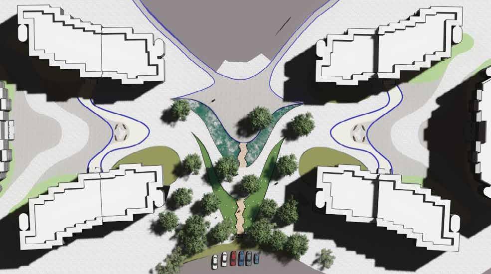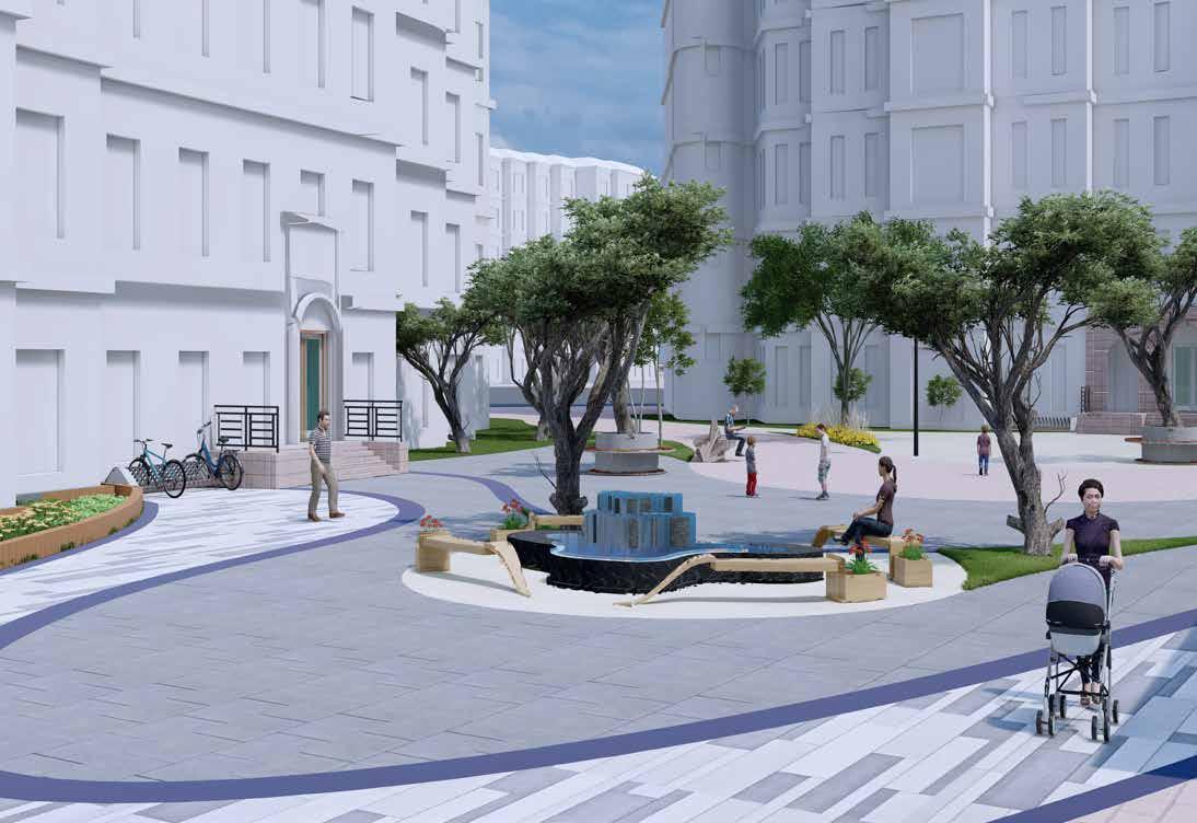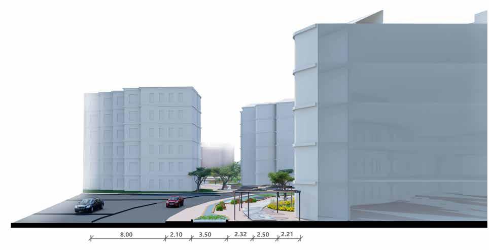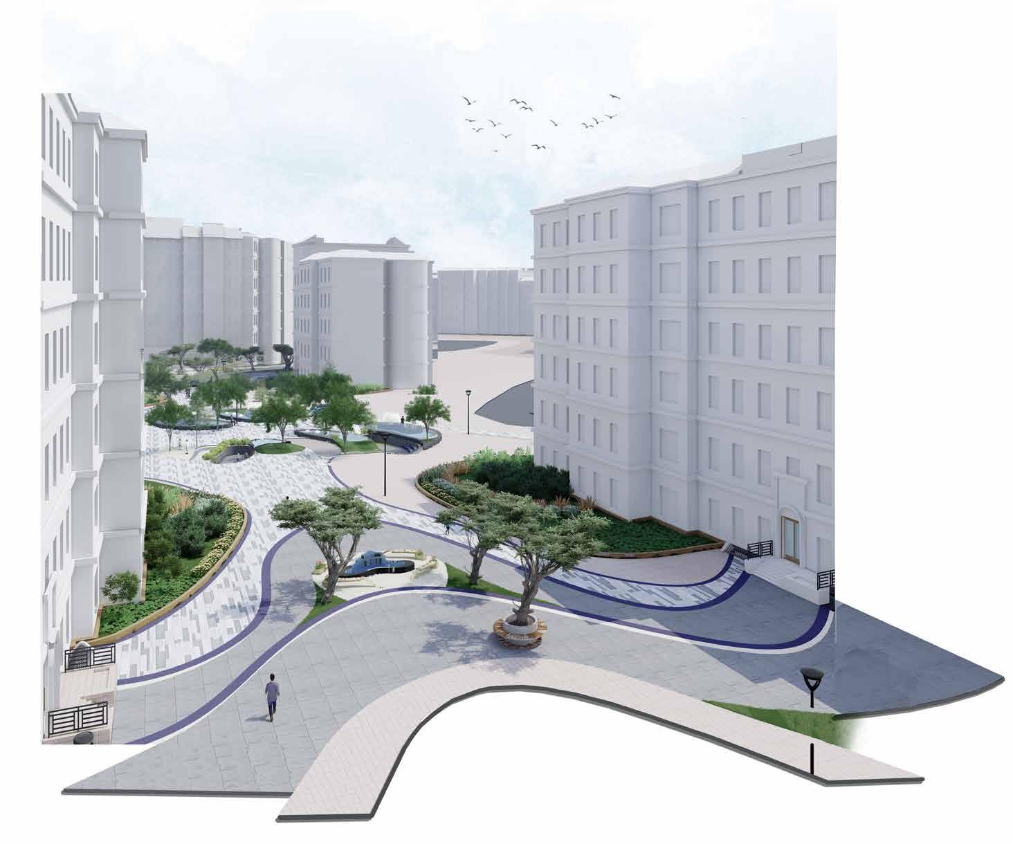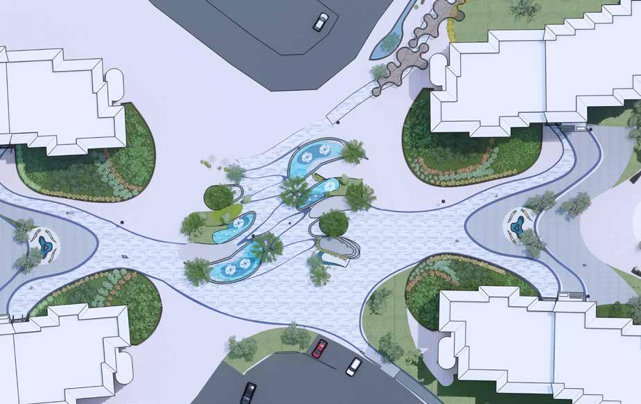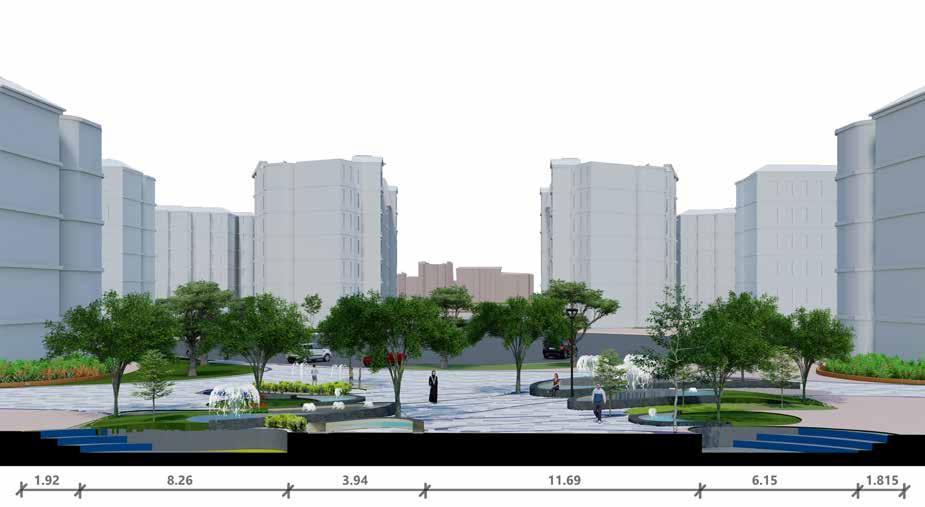 Public plaza becomes a hub for bringing community together. Green pockets are provided with seating as socializing zones.