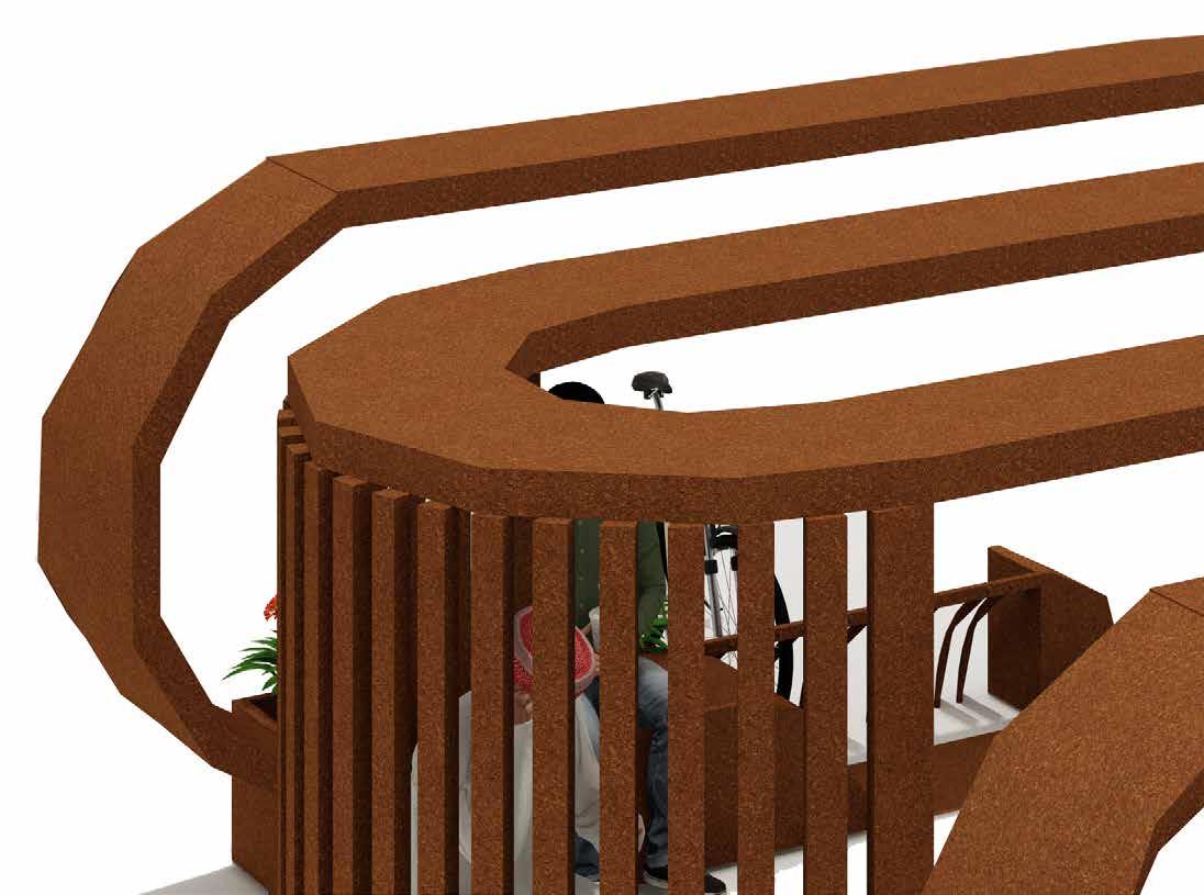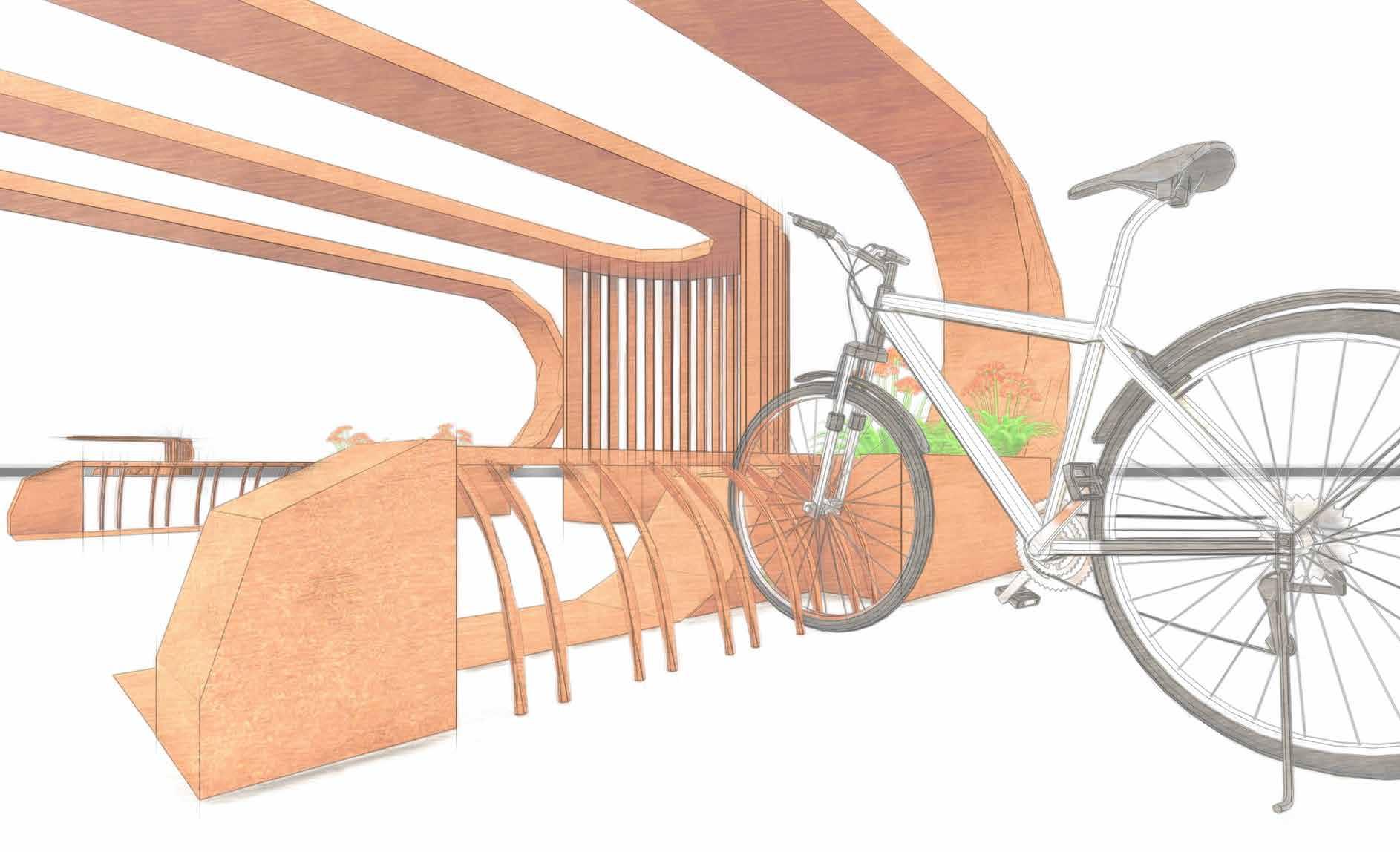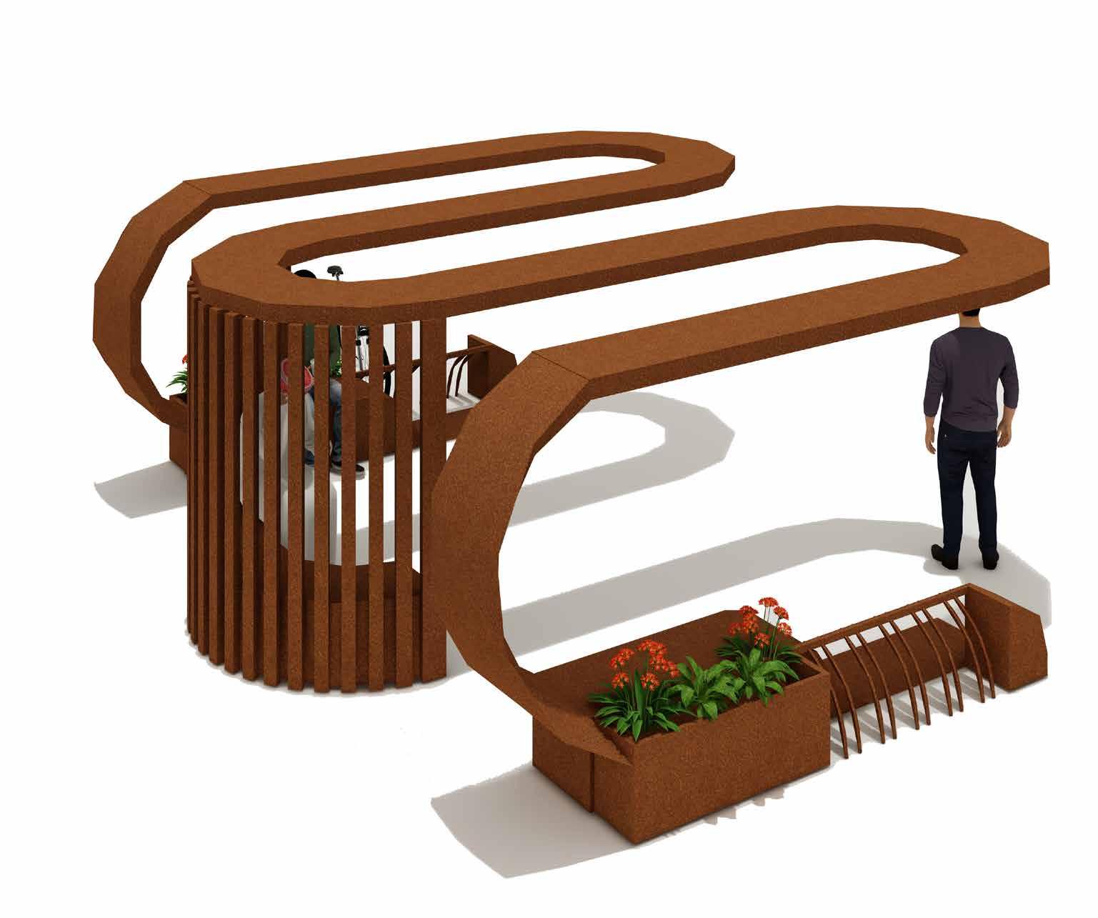The seating is extruded to create plater pods and bicycle stand.