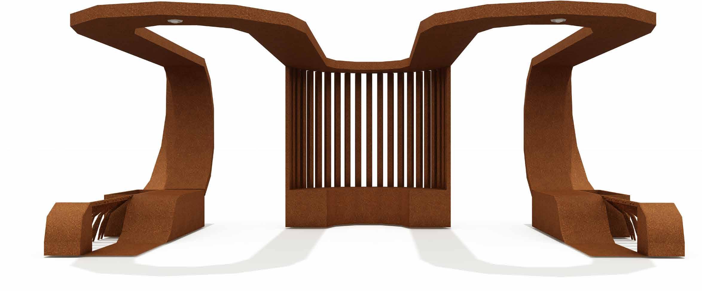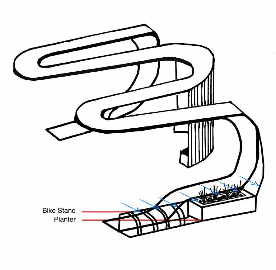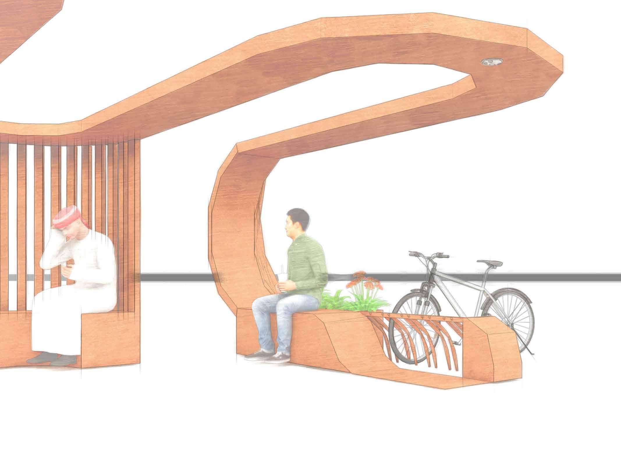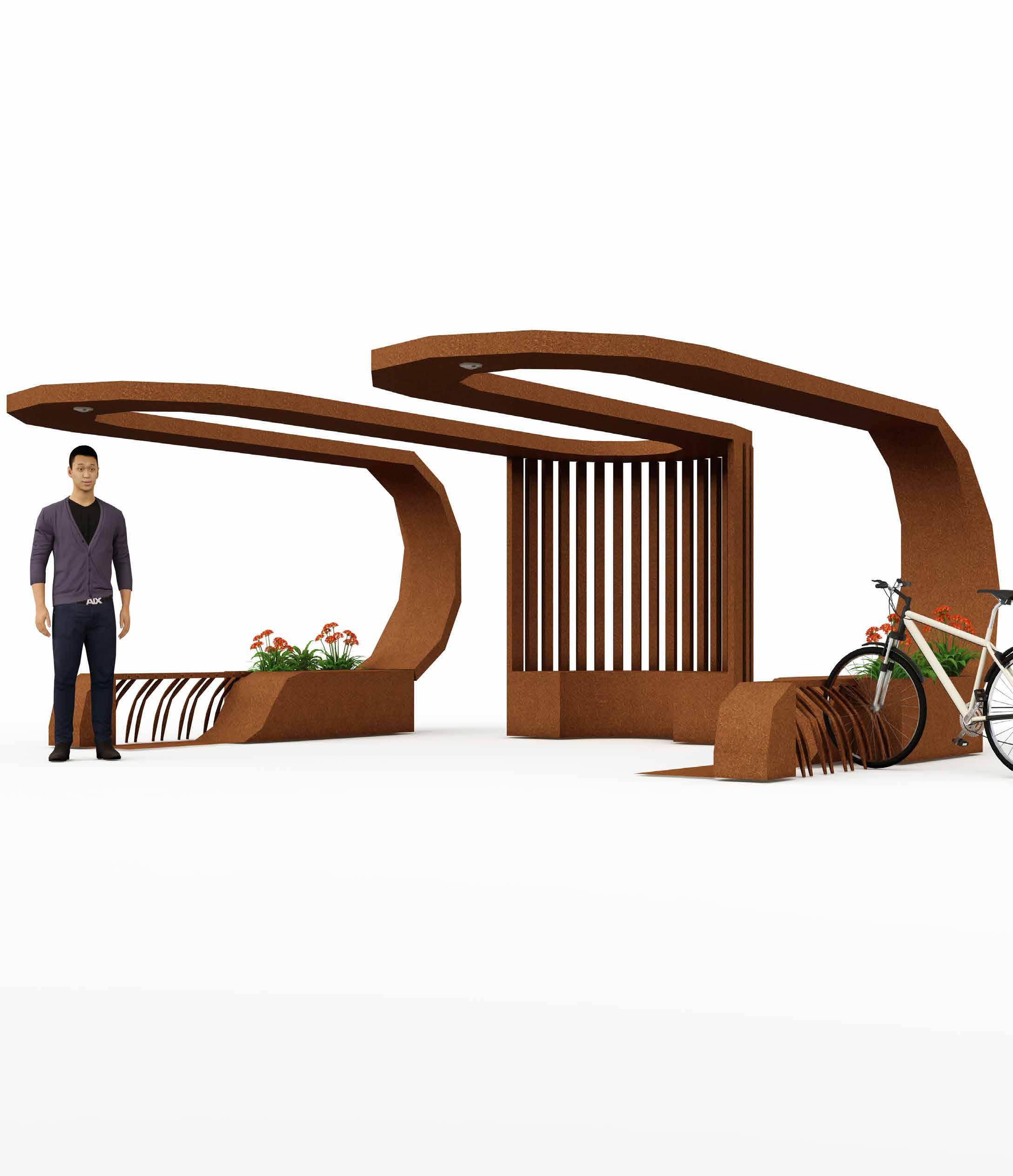 The seating is extruded to create plater pods and bicycle stand.