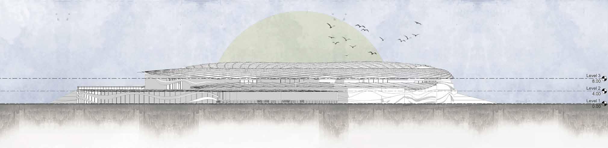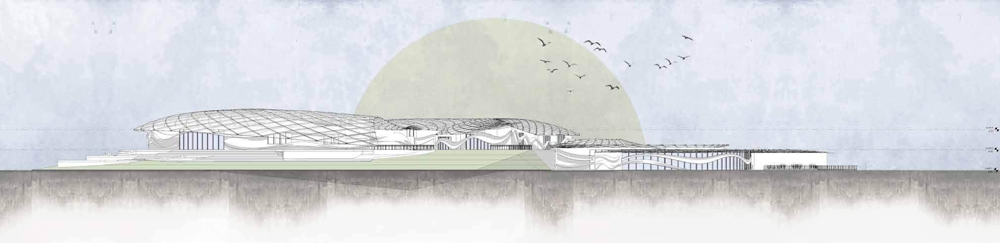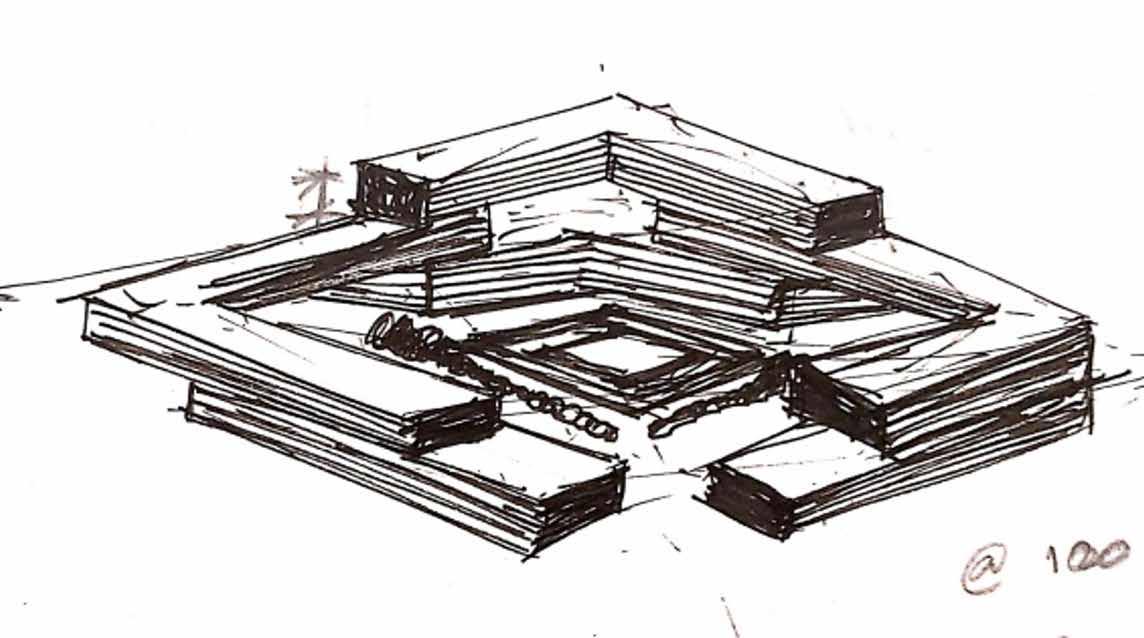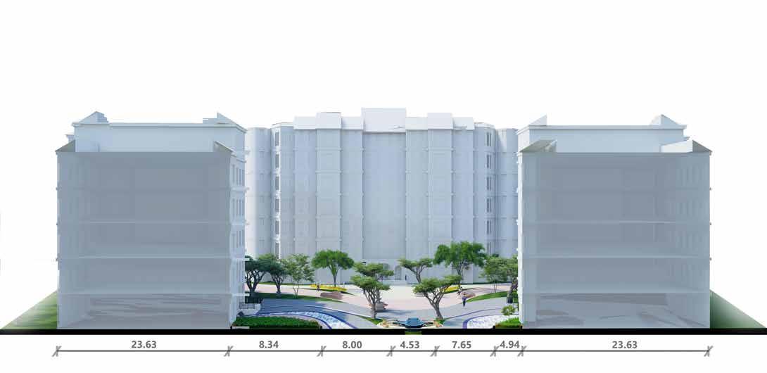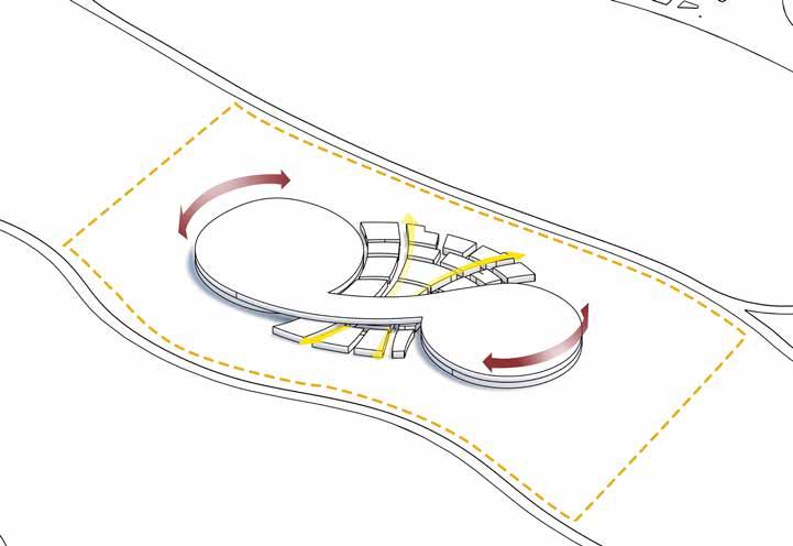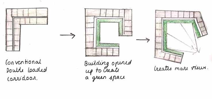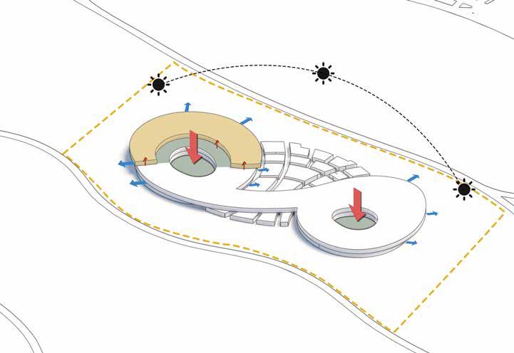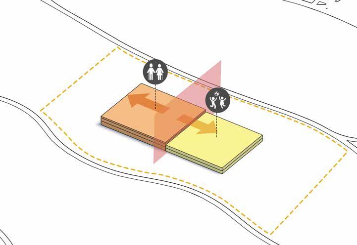 The two major functions are placed on site. The senior citizens centre is placed towards the east of the side considering the north-east wind direction and larger mass of the component.