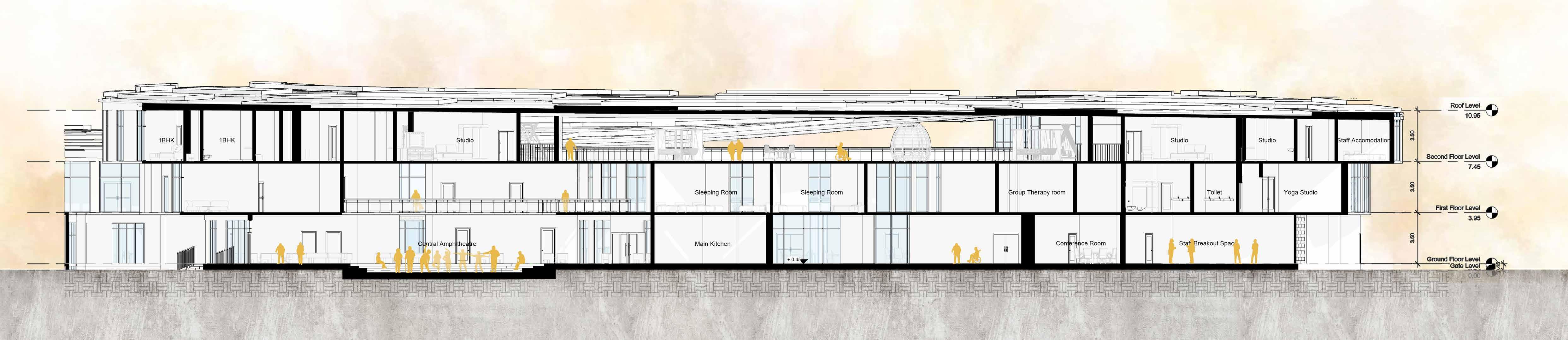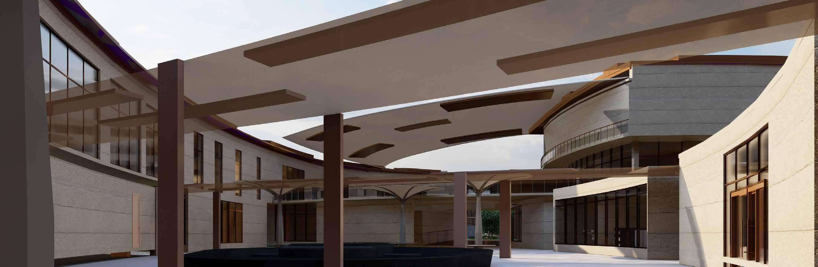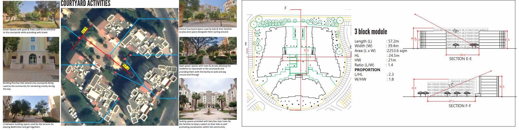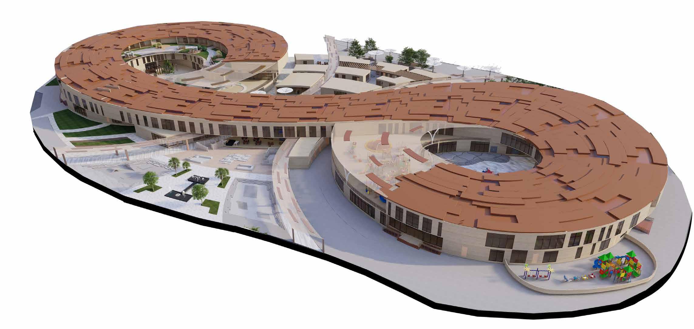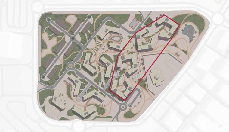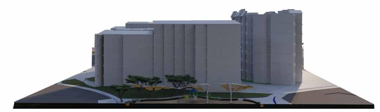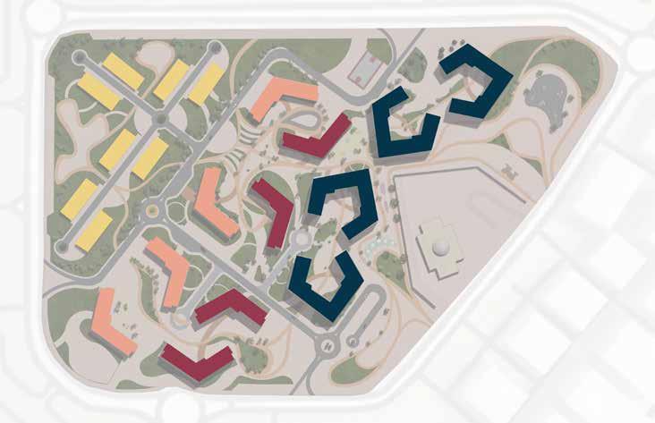 Senior citizens centre is located to the east of the site. Functions are categorized within the building by analysisng the requirements of the senior citizens residing in UAE. The block is mainly divided into 4 zones: Vocational Centre, Recreational zone, Wellness zone and Residential zone.