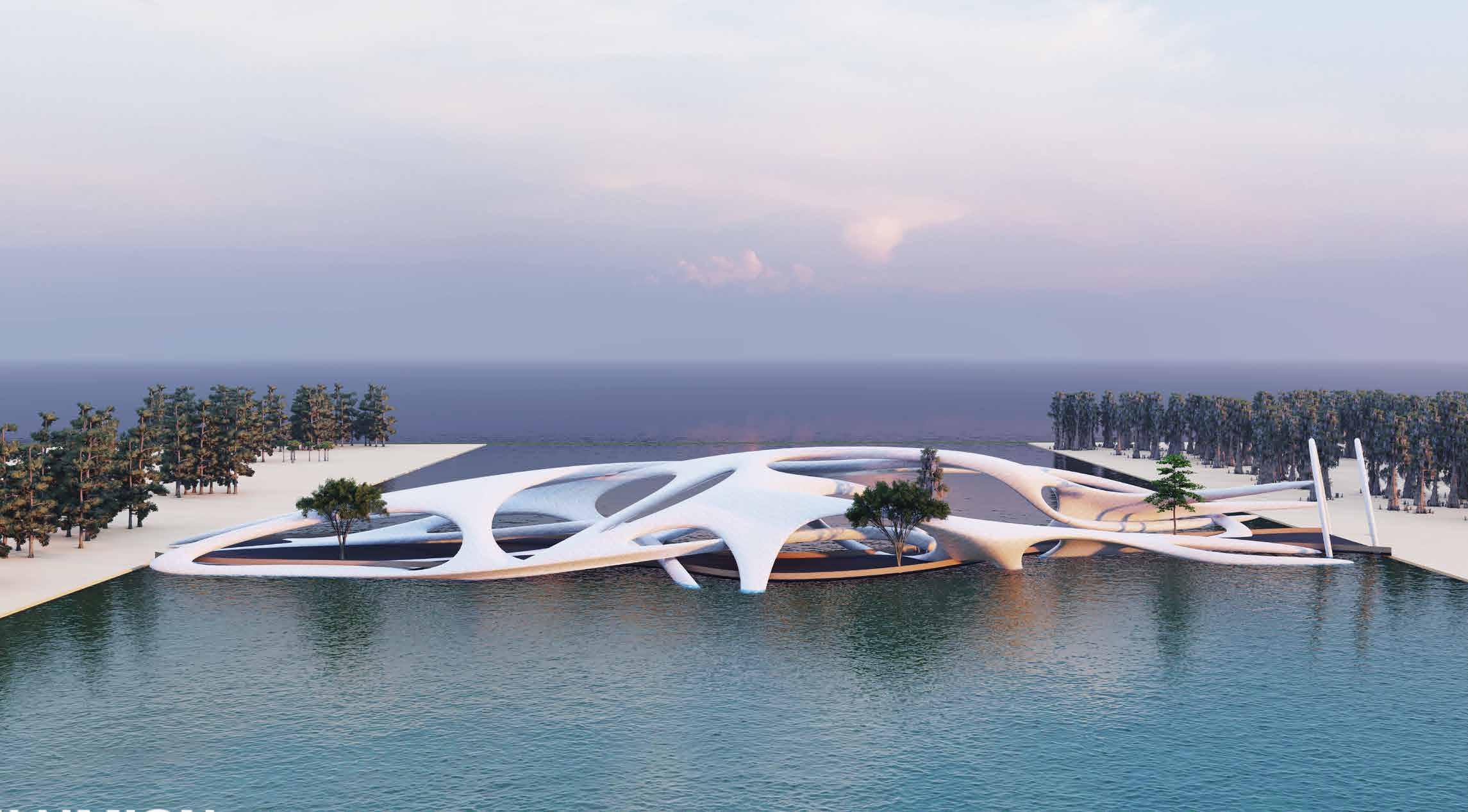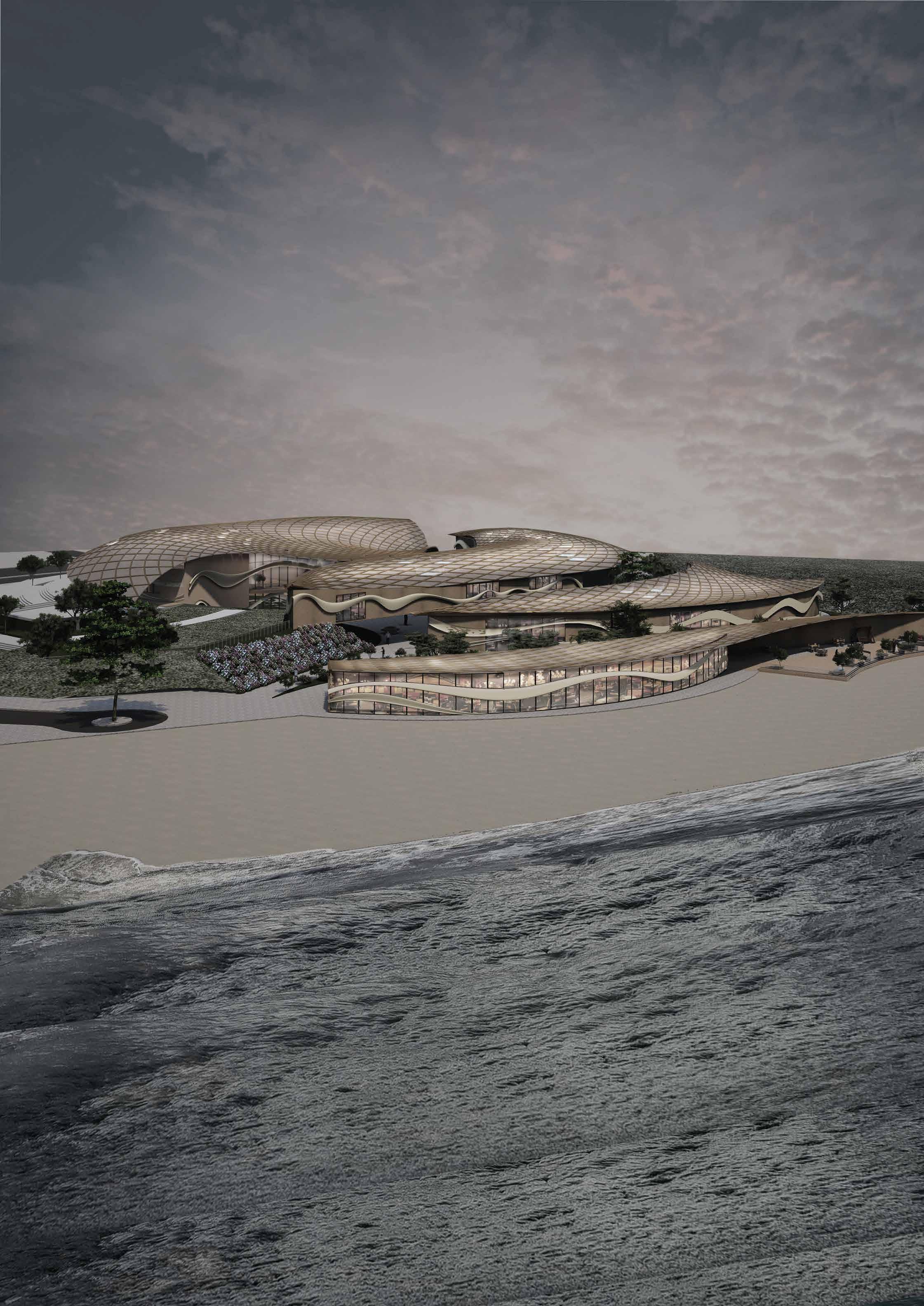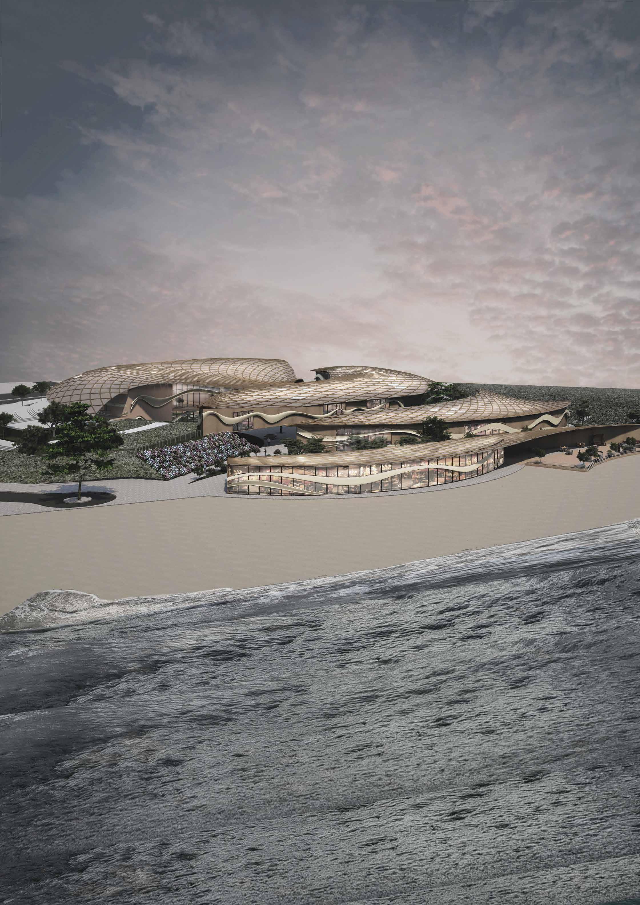 A multisensory seating and relaxation space. Convivial serves as a pause point during the journey through Dubai Design District. It may be used as seating as well as an element to elicit all of the senses within. The form derived from the waves of play moulds to create a multi-sensory functional installation as a point for seating, bicycle stand and for rejuvenation with music.