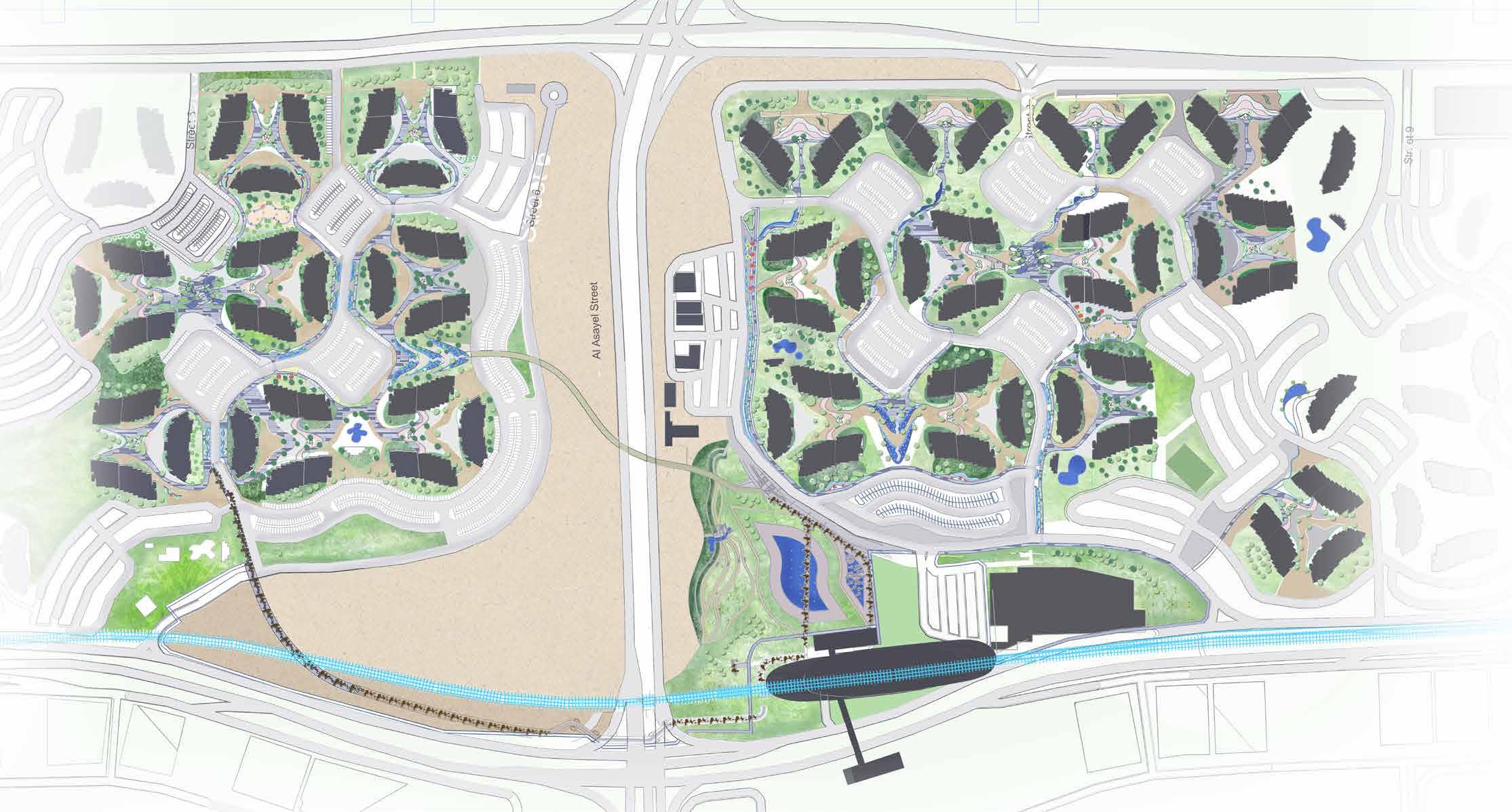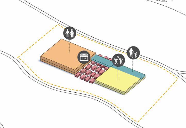 The two blocks are stretched out to break away and create a retail space inspired by traditional souq in between. The intergenerational spaces are placed in the first level creting a more safe and secure environment to foster intergenerational interactions.