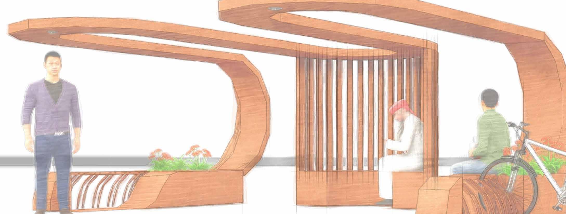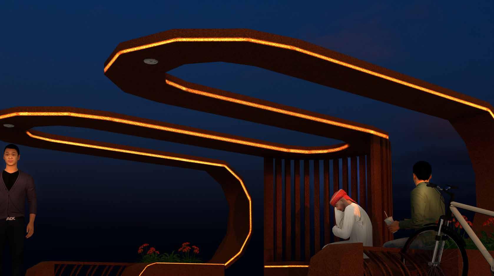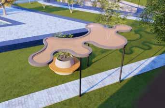 The roof molds in to create curvilinear and linear seating maintaining social distancing, one of the key aspects to be followed in today’s scenario. The linear seatings are provided with planters to evoke the sense of smell within the rest time. The curvilinear seating are enhanced with fluted backrest maintaining the warmth and comfort of the structure as well as plays a role in enhancing the microclimate as the gaps serve for faster wind flow.