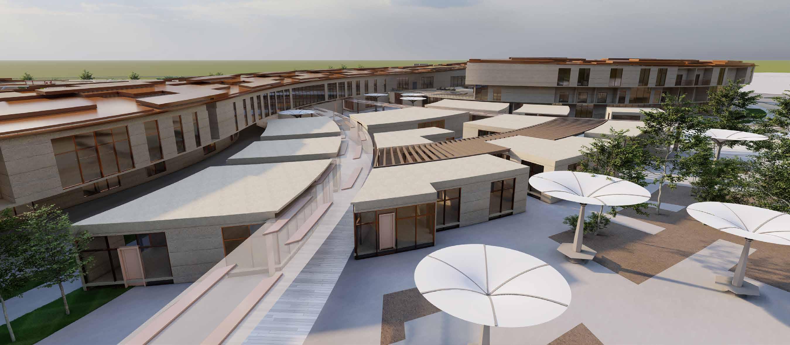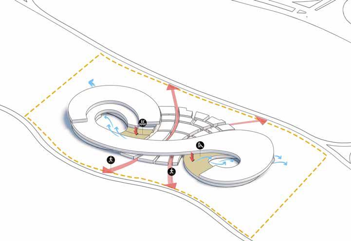 The building form is curved to blend in with the context of the community. The retail spaces are extended outward for better connectivity.