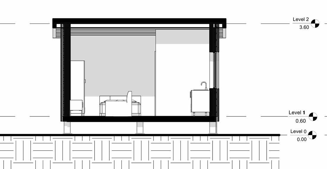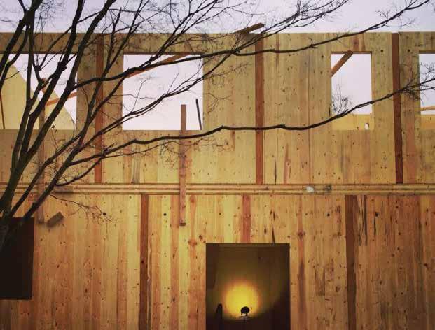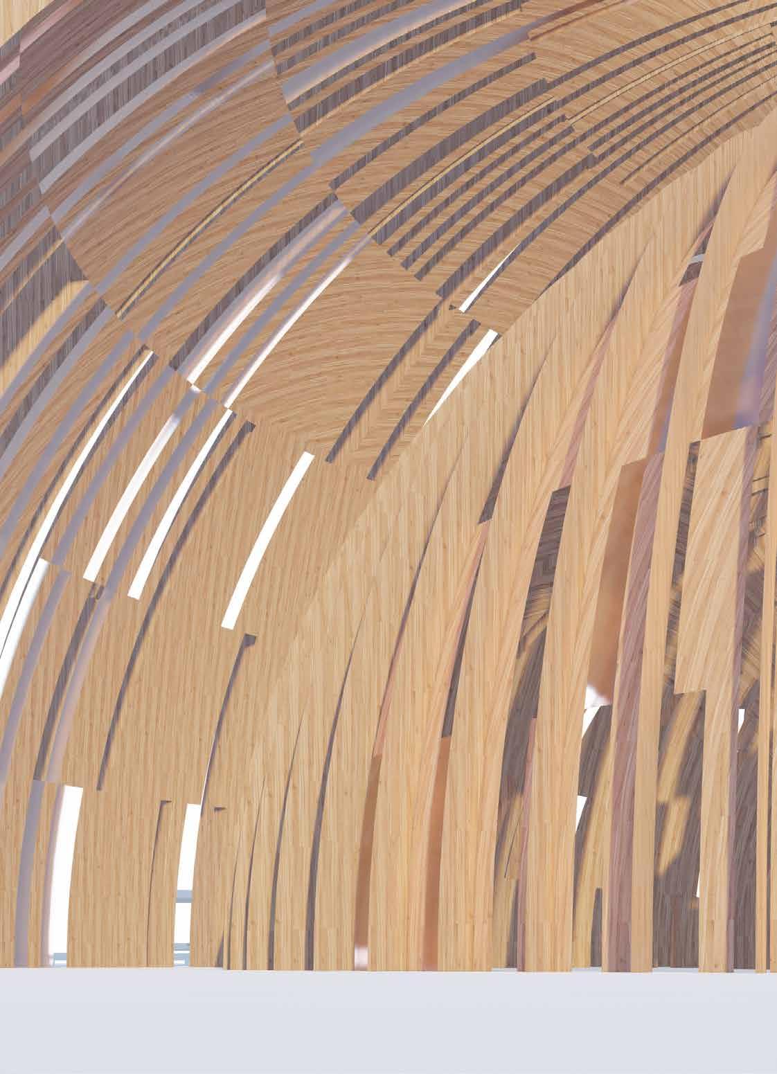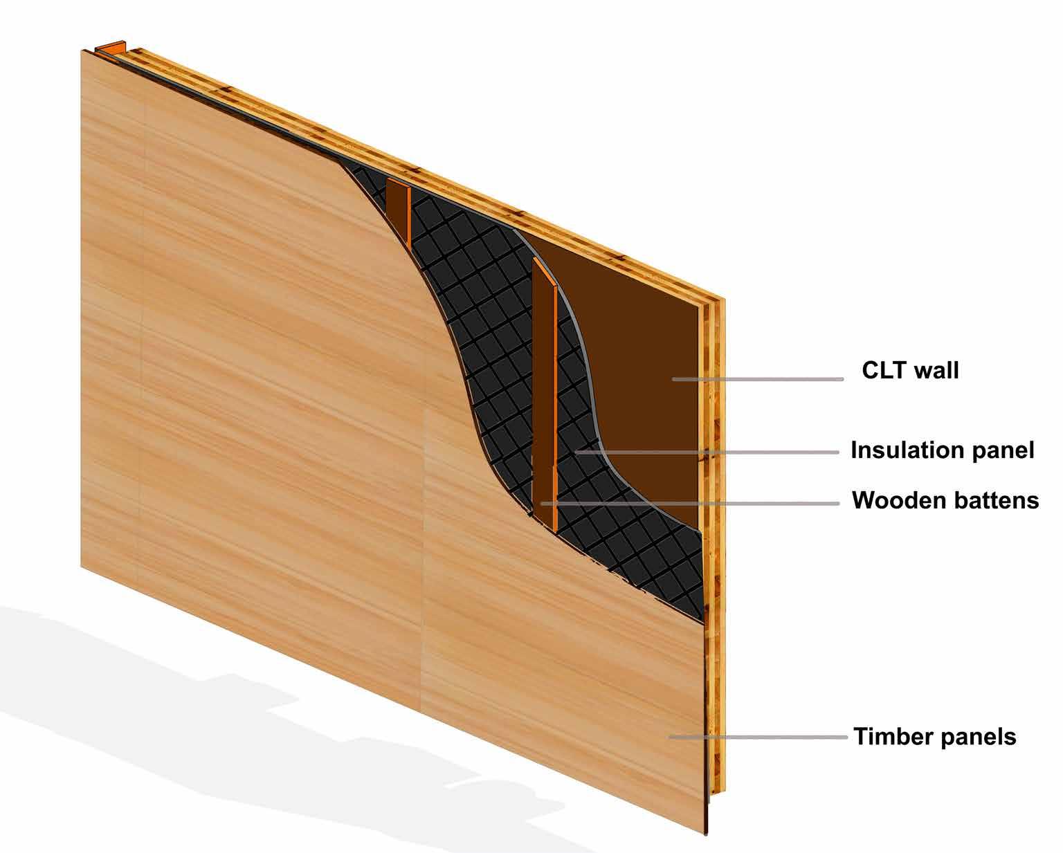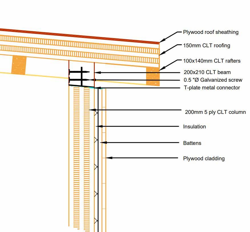 The structural system comprises of various types of cross laminated timber. A prefabricated building material, CLT is a panel made from planks of sawn and glued wood, which are layered perpendicular to each previous layer to create structural rigidity and resilience in both directions.