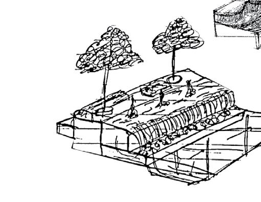 The roof is stretched and molded to create seating. The porosity allows free pedestrian movement throughout.
