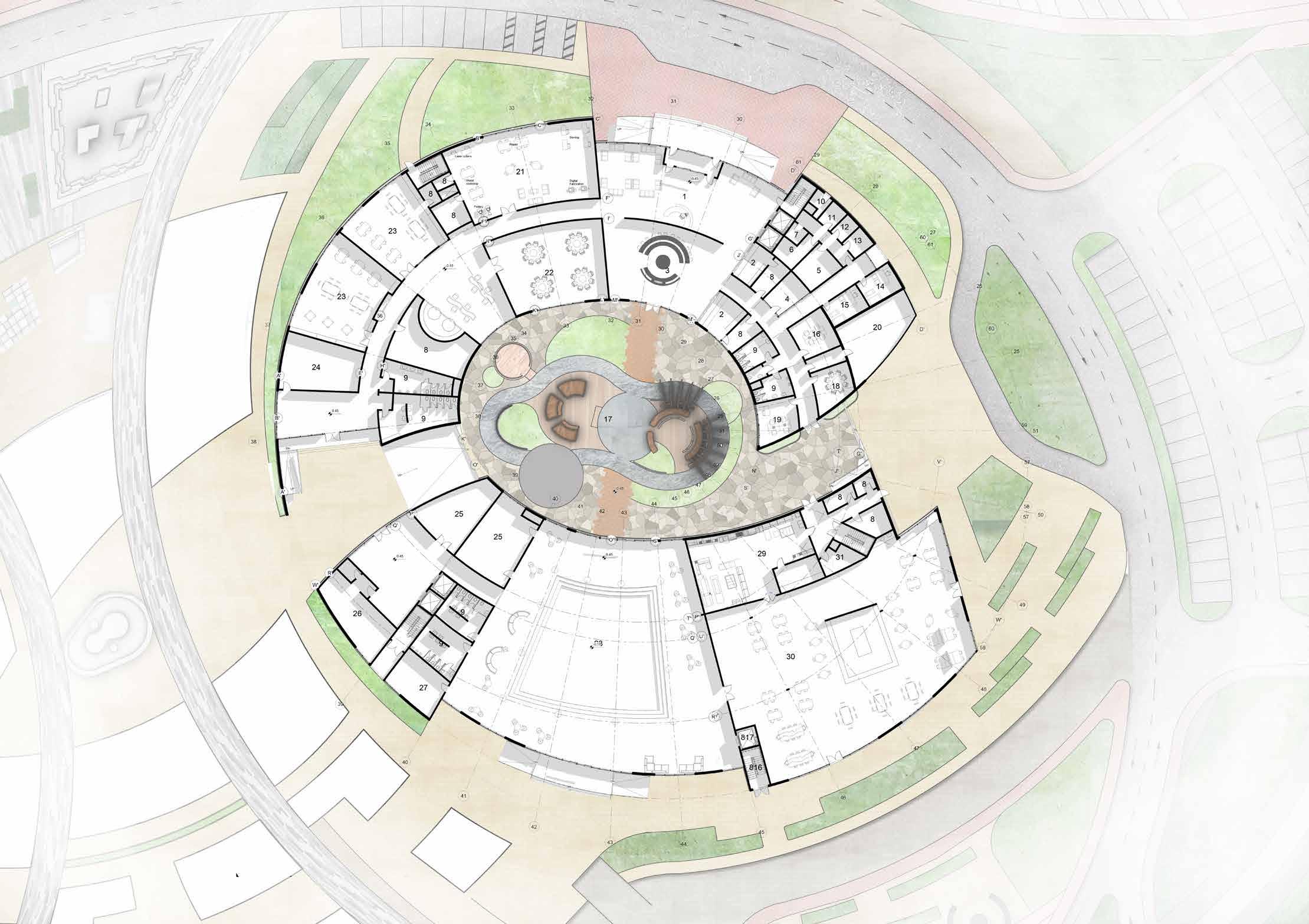 areas Residential block Healthcare 1.Lobby 2.Café 3.Formal loung 4.Marketing and commu department 5.AVAC control room 6.BMS Room 7.Surveillence room 8.Storage 9.Toilet 10.Electrical room 11.Mechanical room 12.Tele. Room 13.LV room 14.CEO room 15.Director’s Room 16.Accounts Room 17.Sensory Garden 18.Conference room 19.IT Dept 20.Staff Breakout Space 21.Makerspace Lab 22.Community room 23.Creative room 24.Pump room 25.Rehearsal room 26.Male prayer room 27.Female Prayer room 28.Central Amphitheatre 29.Main Kitchen 30.Dining hall 31.Garbage room SCALE 1:400 A A’
