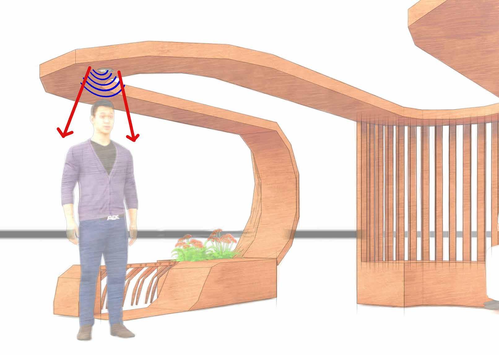 The edge of the roofs are fitted with speakers along with sensors that detects when a user stands below it and plays soothing music further enhancing their relaxation.
