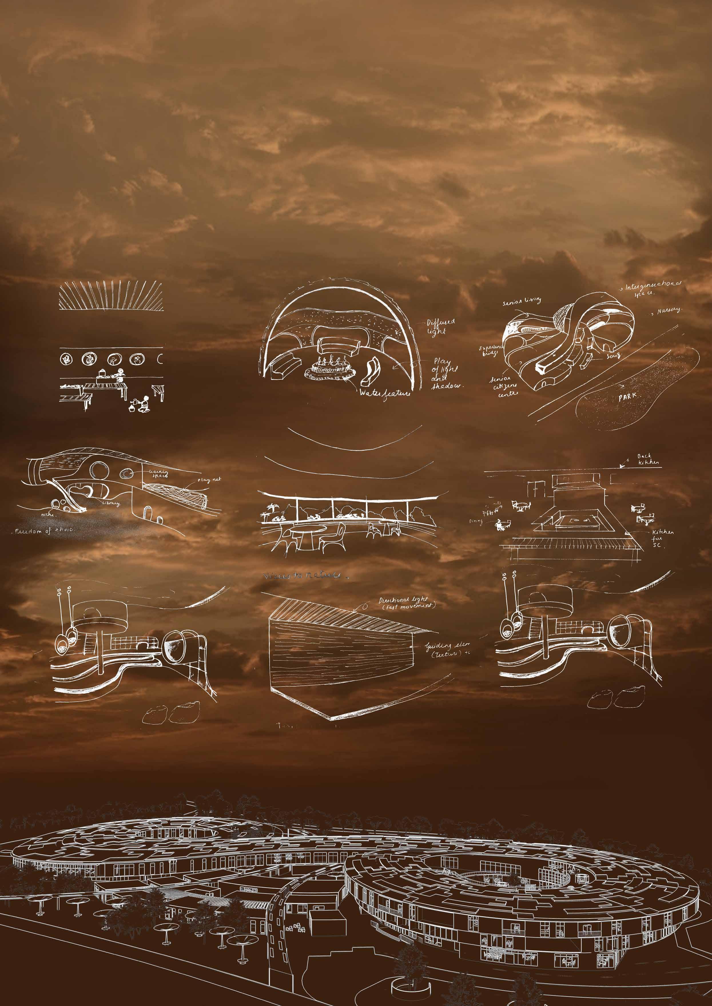 Exuberance Intergenerational complex is an outcome of the thesis design topic that focusses on Intergenerational Spaces for senior citzens and children in built envionments. it is a proposed mixed-use complex includes recreational amenities as well as housing for the UAE’s older population. The recreational facility focuses on intergenerational zones that bring together children and the elderly. The aim of the project is to foster active ageing of senior citizens in UAE. Major requirements for the complex are residence for senior citizens, recreational and entertainment facilities, early learning centre and public services. The idea of a vertical village is devised, with Public plaza and facilities in the lower stratum, recreational facilities for seniors and children in the mid stratum, and a Community Park with apartments for senior citizens in the upper stratum. These three major requirements juxtapose the various building uses in a hierarchy to foster diversity of cross-programming and support inter-generational bonding and promote active ageing in place.