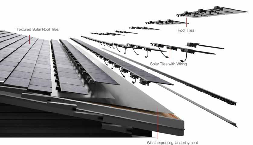 The roof comprises of Solar tiles. These roof shingles are composed of three separate layers. The innermost layer is the high-efficiency solar cell. The middle layer is film that covers the cell and makes it invisible to people. The outermost layer is tempered glass.