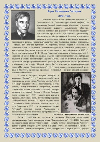 Борис Леонидович Пастернак (1890 - 1960) Родился в Москве в семье академика живописи Л.О. Пастернака и Р. И. Пастернак (урожденной Кауфман), до замужества бывшей профессором Одесского отделения Императорского русского музыкального общества. Наиболее важными для духовного становления будущего поэта явились три события: приобщение к христианству, увлечение музыкой и философией. Родители исповедовали иудаизм, а русская няня тайком от них водила мальчика в православную церковь. Первое творческое увлечение Пастернака, наряду с рисованием, - музыка. Но, получив признание А. Скрябина, юноша порвал с музыкальным сочинительством. По окончании гимназии (1906) учился в Московском университете; с юридического факультета перешел на историко-филологический (окончил в 1913 г.). Здесь под руководством Г. Г. Шпета Пастернак знакомится с феноменологией Э. Гуссерля, а в апреле 1912 г. на скудные средства родителей отправляется в Марбург для обучения у главы неокантианцев Германа Когена. Там он получает возможность продолжать карьеру профессионального философа, но прекращает занятия философией и возвращается на родину. "Прощай, философия"— эти слова из автобиографической повести Пастернака "Охранная грамота" (1931) теперь значатся на мемориальной доске дома в Марбурге, где некогда проживал безвестный студент, ставший всемирно почитаемым классиком. В печати Пастернак впервые выступил в альманахе "Лирика" (1913; 5 стихотворений), затем появились его книги стихов "Близнец в тучах" (1914) и "Поверх барьеров" (1917). Возвратившись к этим стихам, многое исключив и переработав, добавив появившиеся затем в периодике, поэт выпустил через двенадцать лет новый сборник - "Поверх барьеров. Стихи разных лет" (1929) - своего рода расчет с прошлым. Настоящим своим поэтическим рождением Пастернак считал лето 1917 г. - время создания книги "Сестра моя - жизнь" (вышла из печати в 1922 г.). До того Пастернак в 1913 г. в литературном кружке "Мусагет" прочитал доклад "Символизм и бессмертие", где уже проступала программа нового, Б.Пастернак с женой Зинаидой и сыном Леней постсимволистского сознания. Рубеж 1920-1930-х гг. сказался в эволюции Пастернак мучительной напряженностью. После завершения поэмы "Высокая болезнь" (1923-1928) Пастернак завершает роман в стихах "Спекторский" - о судьбе русского интеллигента, "которого должно вернуть истории" (1931, начат в 1925).В 1929 г. он публикует "Повесть" с одноименным героем стихотворного романа, которую считал первой частью будущей 6