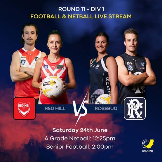 Rosebud will need to watch out with midfielders Danny Allsop, Jake Di Pasquale and Josh Clayton solidagainlastweekastheirstrongrunsofformin 2023 continues. The trio combined for 75 disposals and13clearancesastheystarredinfrontofahuge crowd on King’s Birthday Weekend. Another to watch is Jonah Siverson, who’s marking prowess has added a lot to Red Hill’s forward line in recent weeks and a big game from last season’s Team of theYearCaptainwillgoalongwaytosecuringthe Hillmenthe4-pointhere.
