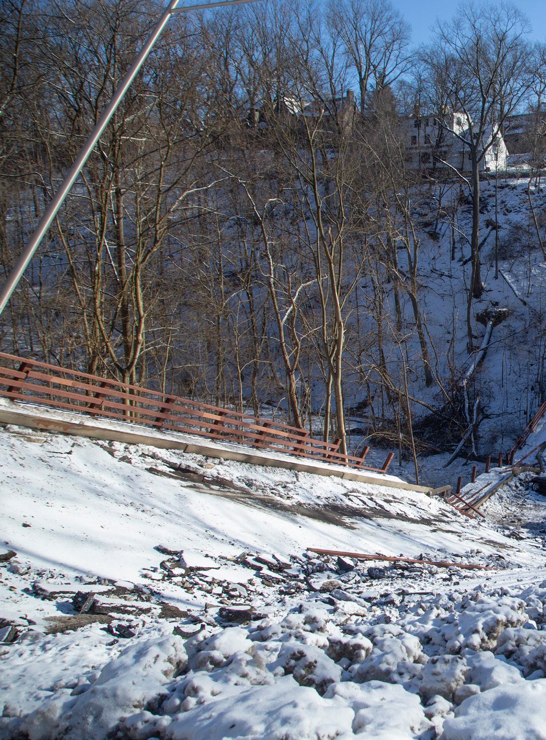 The Fern Hollow Bridge carried Forbes Road over a ravine at the north end of a local park. A light snow was still falling when it collapsed about an hour before dawn on 28 January, 2022.