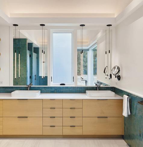 BLUEBIRD: Natural and nature-inspired materials finish the kitchen (opposite), primary bath (this photo), and other key spaces. “The combination of the wooden top line with the white in the kitchen is beautiful,” one judge said.