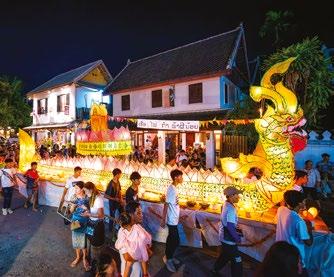 Each year, the end of Buddhist Lent in Luang Prabang is marked by the enchanting Lai Heua Fai – or Festival of Light Boats. As darkness falls, thousands of candlelit floats meticulously crafted from bamboo, paper, and flowers are gently released onto the Mekong River to form an armada of flickering lights. Locals parade illuminated floats through the streets, temples glow with lanterns, and chants echo across the town. This spellbinding festival blends devotion, artistry, and community spirit, honouring the river spirits and symbolically letting go of past misfortunes. Set against the golden temples of one of Southeast Asia’s most beautiful towns, the festival offers an unforgettable glimpse into Laos’s living spiritual heritage. www.tourismlaos.org/event/ lhai-heua-fai-festival-of-the-boats-of-light-inluang-prabang-province-2
