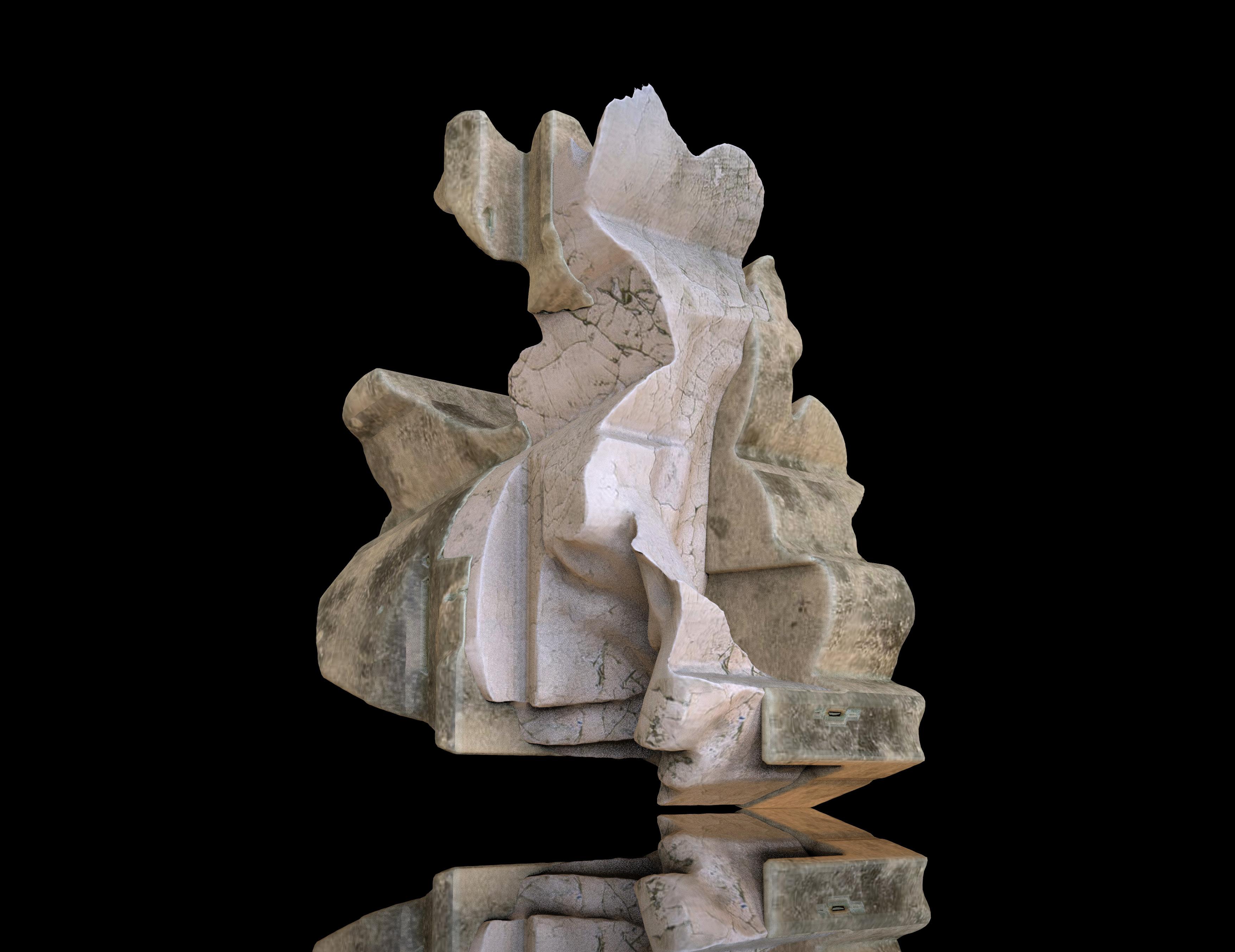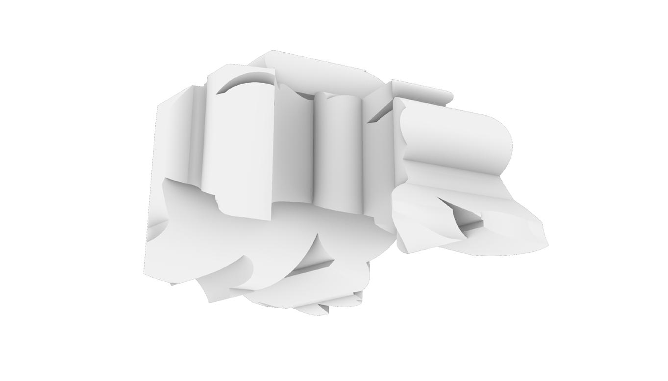 This studio project focuses on the relationship of drawing and representation to form and objects. The following project progressed through a series of drawing pinups, physical and digital model studies, and material experimentation. The goal of the assignment was to translate the geometry of a 3D scan mesh of a sculpture into Rhino NURBS surface geometry through a series of elevational curve tracings, extrusions, and boolean operations. This method of geometric production was then converted into a surface geometry that can be mathematically unrolled in Rhino without deformation, so it can be made as a model out of non deformable materials like paper.