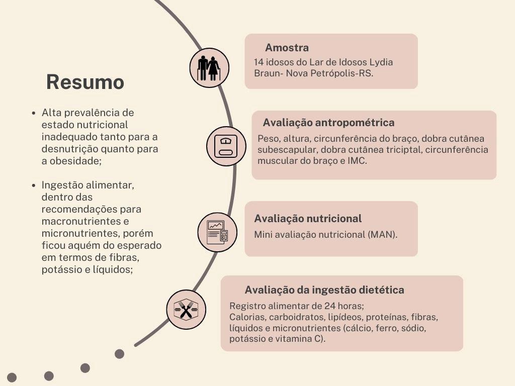 O envelhecimento é caracterizado por alterações fisiológicas que podem influenciar na alimentação, estado nutricional e qualidade de vida de idosos. Método: Estudo transversal com idosos residentes em uma Instituição de Longa Permanência de Idosos (ILPI) no município de Nova Petrópolis – RS, através da Mini Avaliação Nutricional (MAN), avaliação antropométrica, índice de massa corporal (IMC), ingestão alimentar e quantidade de medicamentos. Resultados: A maioria dos indivíduos foram considerados eutróficos (IMC médio 24,3 Kg/m²), apresentaram eutrofia na avaliação de circunferência muscular do braço e desnutrição nos parâmetros de dobra cutânea triciptal e circunferência do braço. Segundo a MAN, metade dos participantes estavam sob risco de desnutrição. Os macronutrientes estavam adequadamente distribuídos e a média calórica diária foi de 1586 calorias. A ingestão de fibras e líquidos ficou abaixo do recomendado.